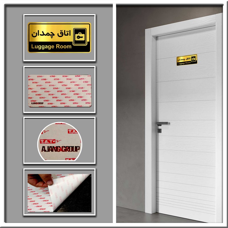 تابلو نشانگر گروه آژنگ طرح اتاق چمدان برای سهولت دسترسی هتل ها قابل استفاده است. این تابلو ازجنس مولتی استایل طلایی خشدار ساخته شده ویکی ازنقاط قوتش این است که بانور محیط انعکاس زیبایی به خودش میگیرد درنتیجه بهتر خوانده میشود وبا هرنوع دکوراسیونی همخوانی دارد ویکی از آیتم های مهم تابلو راهنما خوانابودن است که این یکی از ویژگی های منحصربه فرد این محصول میباشد و همچنین دارای سه مدل علائم می باشد که برای هرمجموعه ی بین المللی کاربرد دارد . با چسب دو طرفه ای مقاومی که دارد موجب نصب آسان و صرف وقت کم برای مشتری گردیده است.