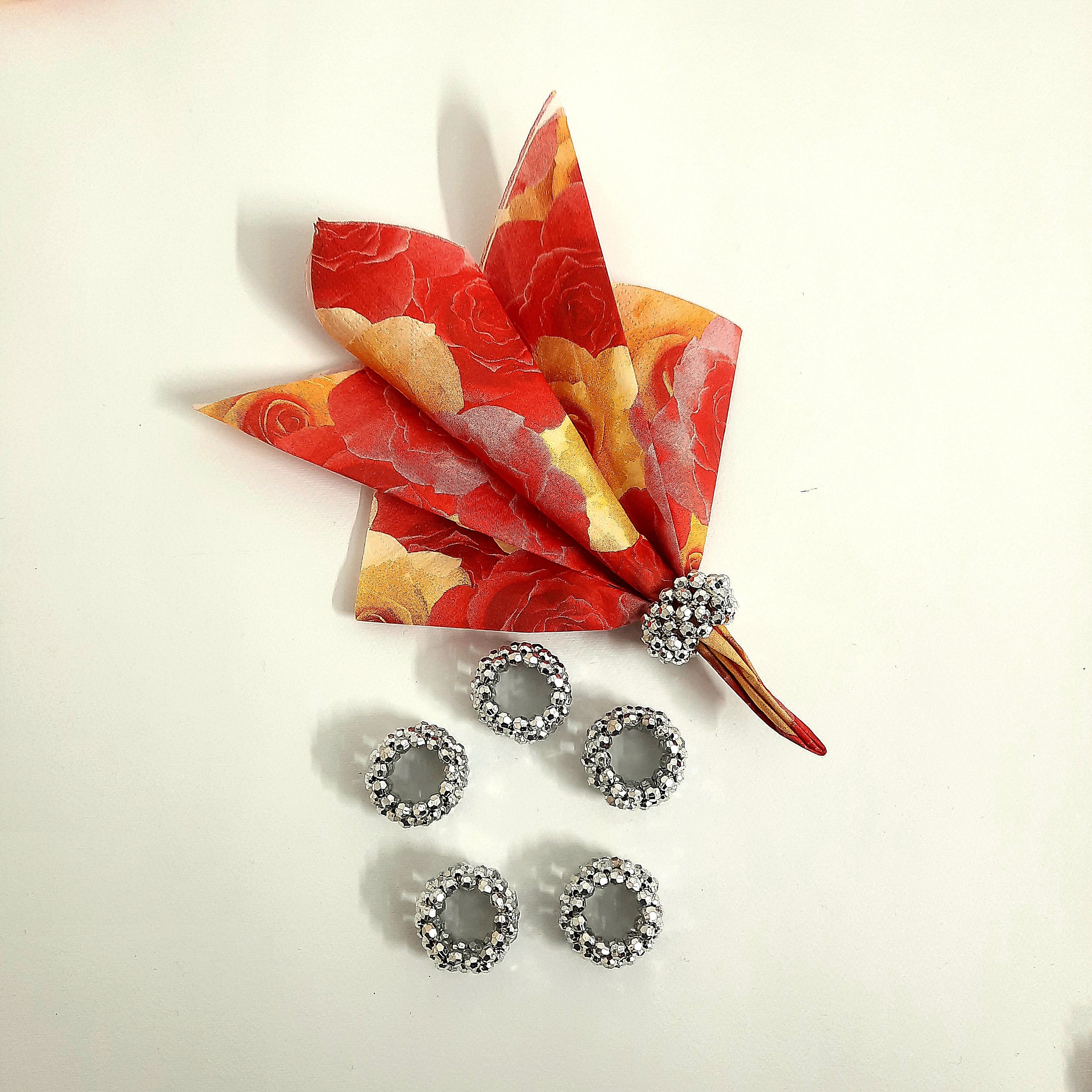 میزآرایی هنری است که در مراسم و میهمانی ها چشم همگان را به خود جلب می کند. هر چیزی که باعث درخشش میز شما شود، جلوه ای خاص و زیبا به میهمانی شما می بخشد. این حلقه با نخ ابریشم بافته شده هم برای دستمال کاغذی و هم برای دستمال پارچه ای کاربرد دارد. شما می توانید دستمال کاغذی را به اشکال مختلف درست کرده و از این حلقه به عنوان چند برابر کردن زیبایی آن استفاده کنید. وزن تقریبی هر حلقه حدود 5 گرم می باشد.