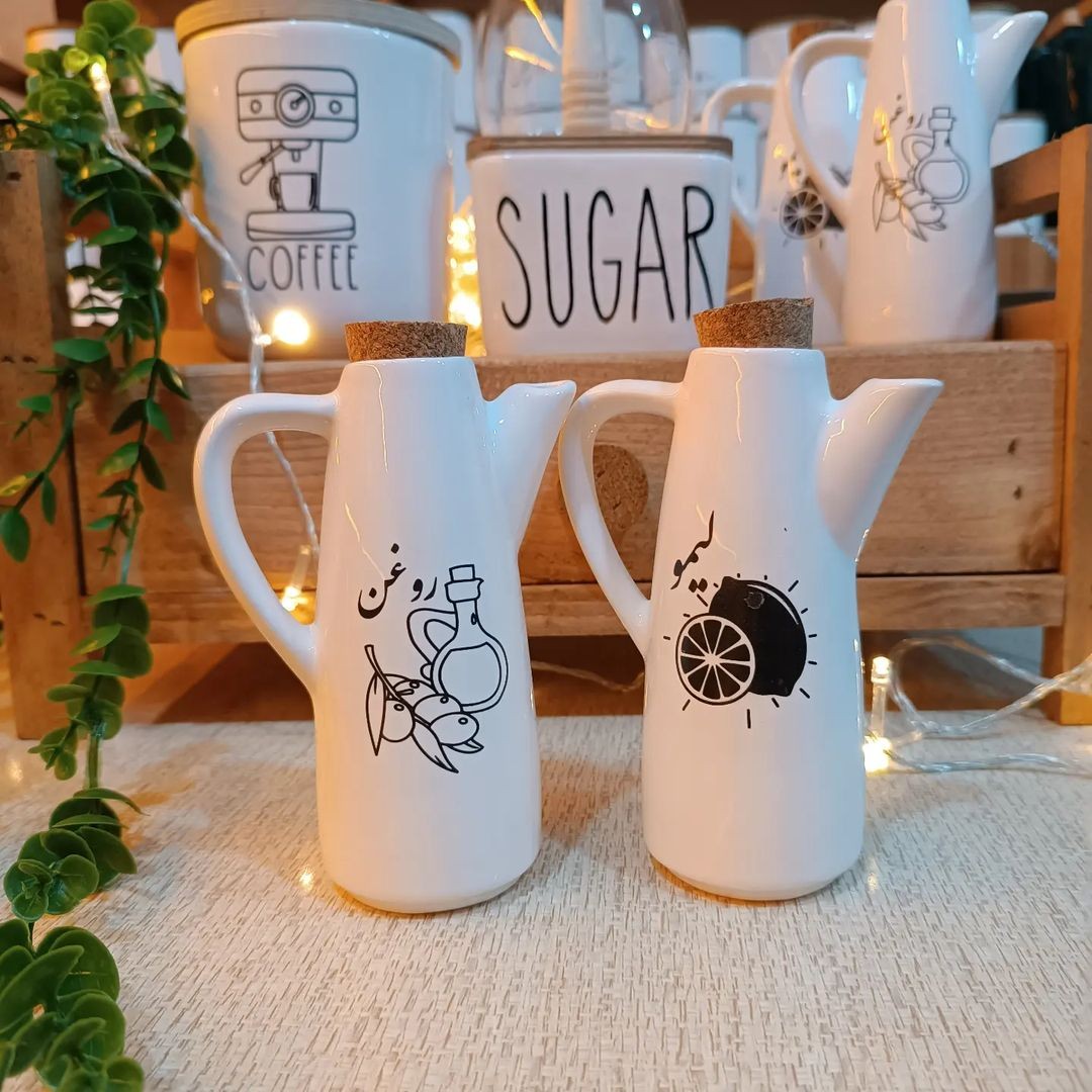 یک عدد روغن ریز و یک عدد آبلیمو خوری با نوشته فارسی مطابق تصویر ظرفیت هر کدام 250 میلیلیتر ارتفاع 14 سانت