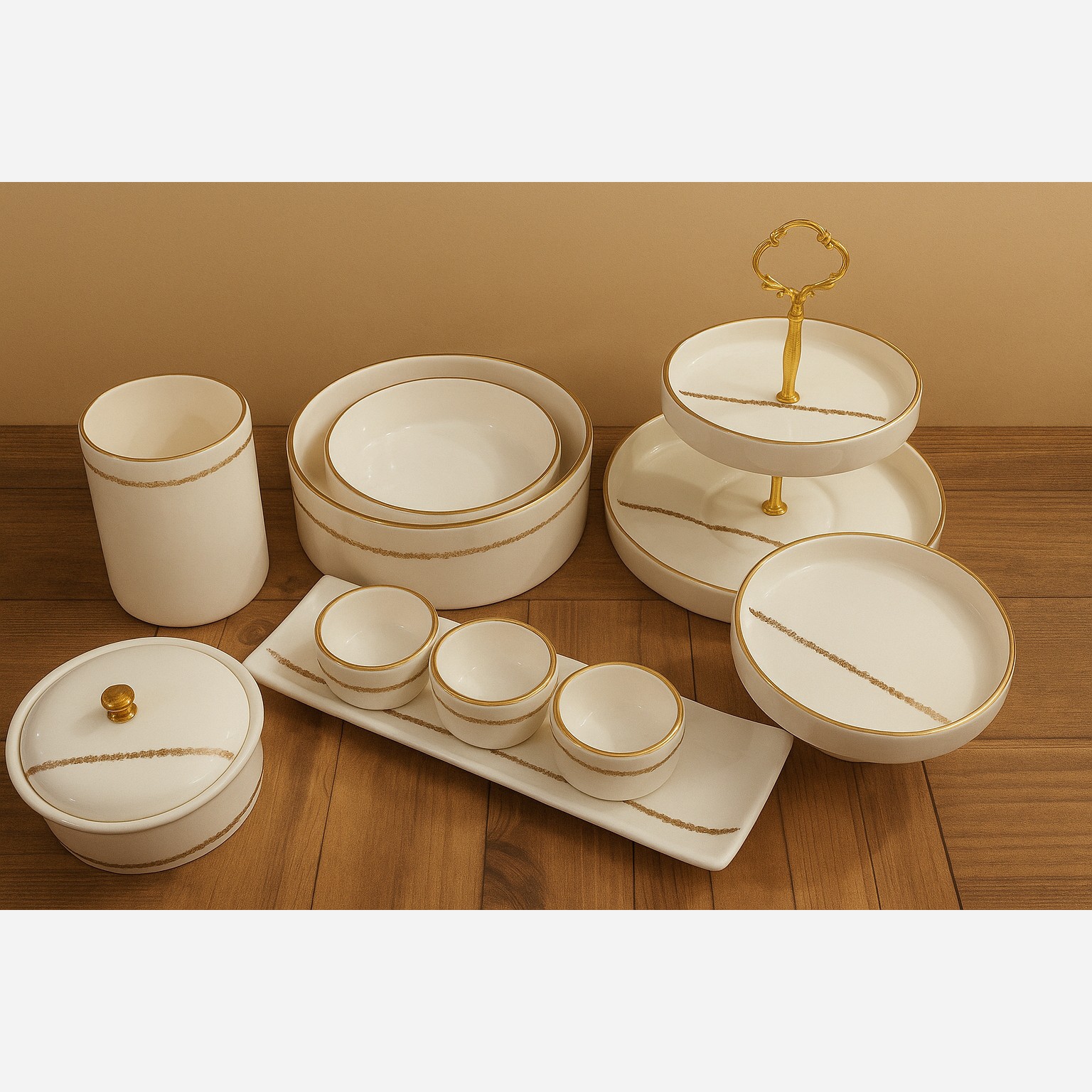 سرویس پذیرایی شامل میوه خوری کاسه سایز 25سانت شیرینی خوری دو طبقه شکلات خوری 14سانت گلدان اردو خوری سرامیکی باقلوا خوری پایه دار 18سانت