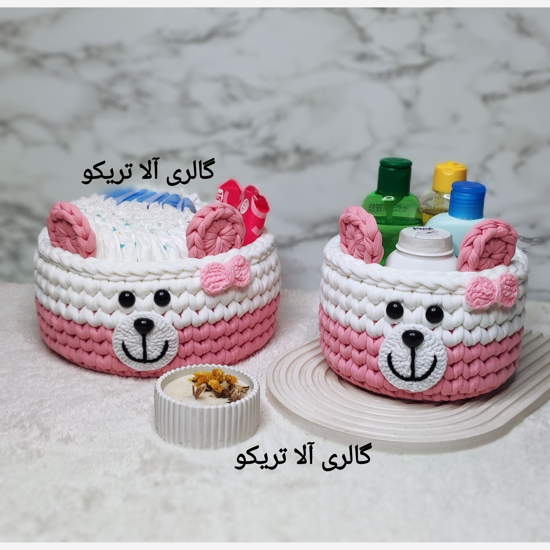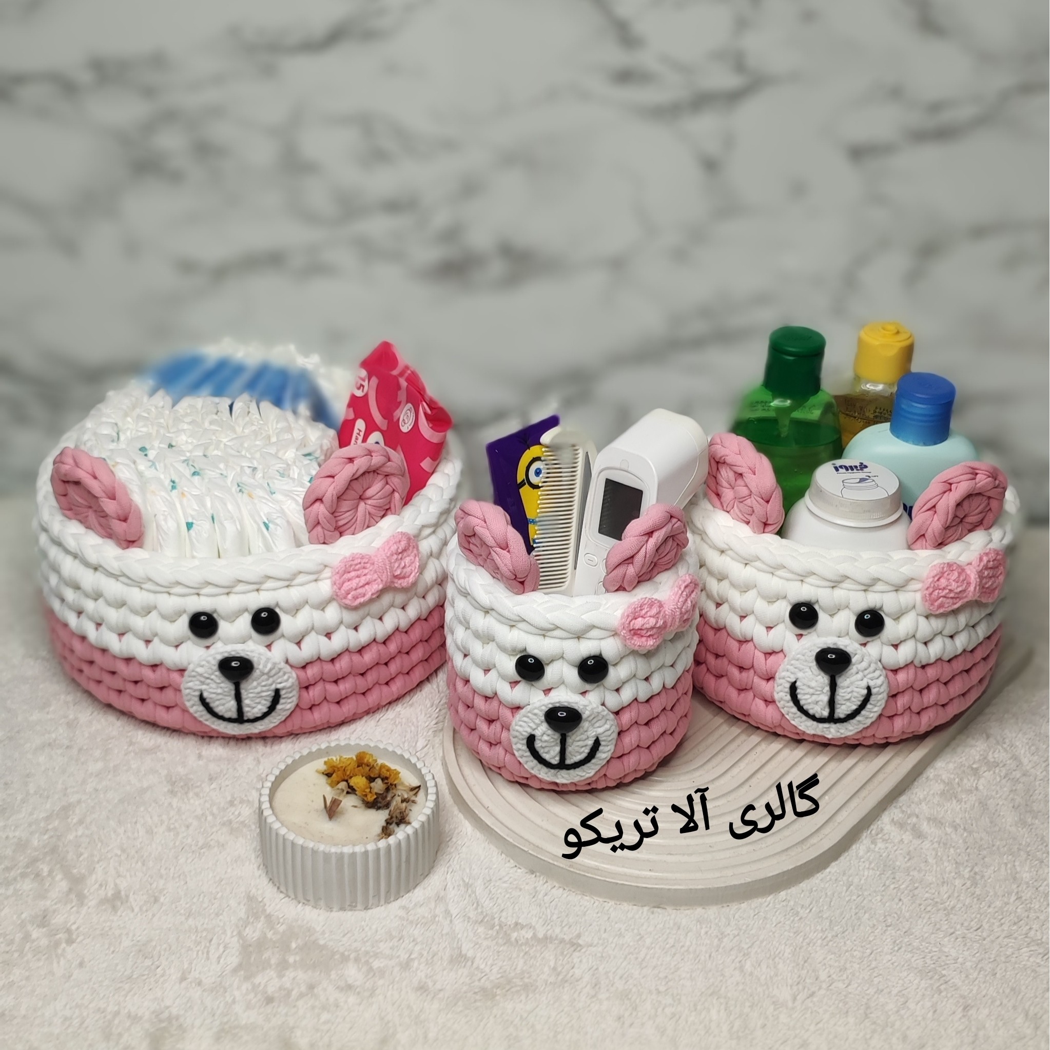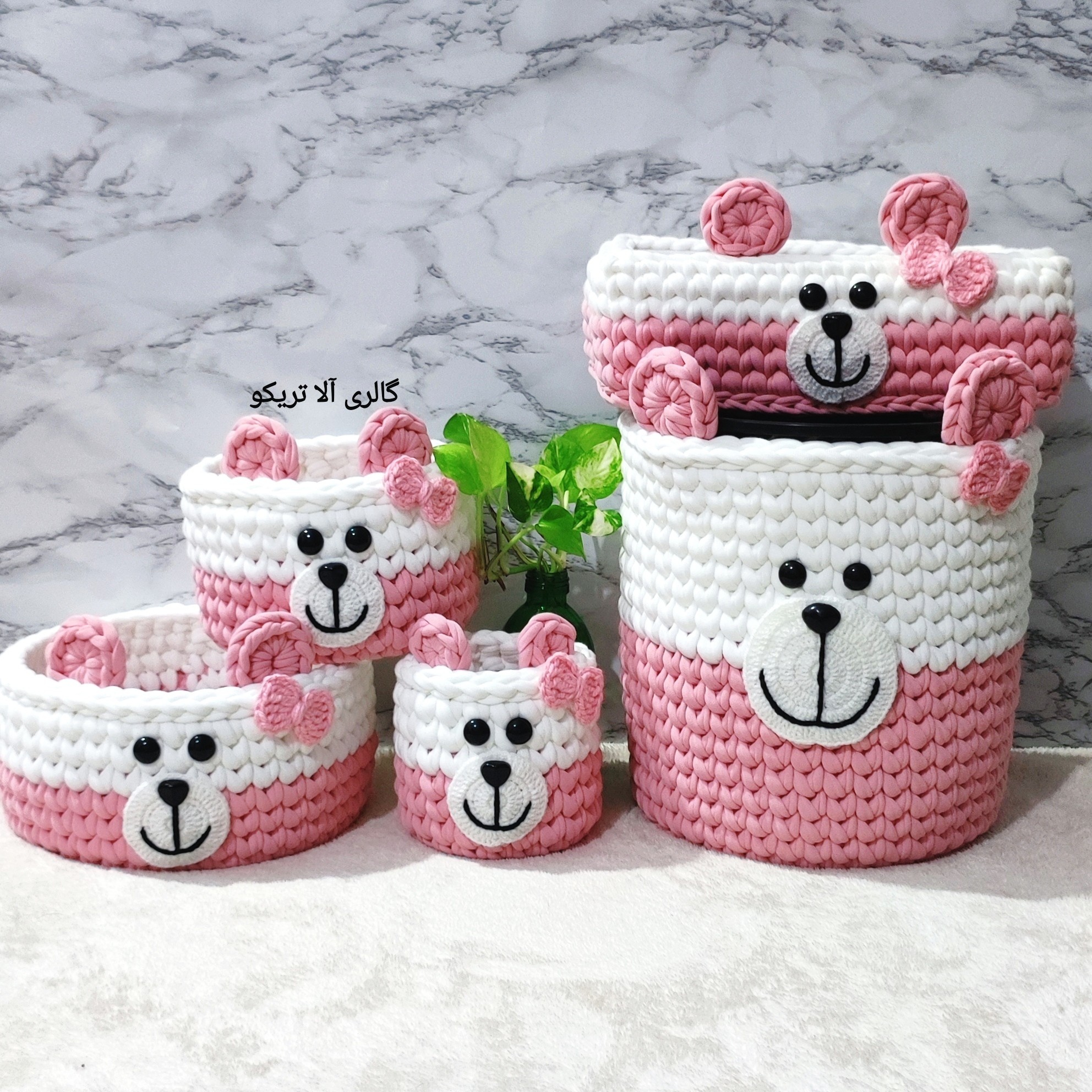 ست کامل 5 تایی سبد تریکو باکس نظم دهنده وسایل سیسمونی نوزاد و کودک مدل خرس تدی دخترانه صورتی مبلمونسرا مدل 287746