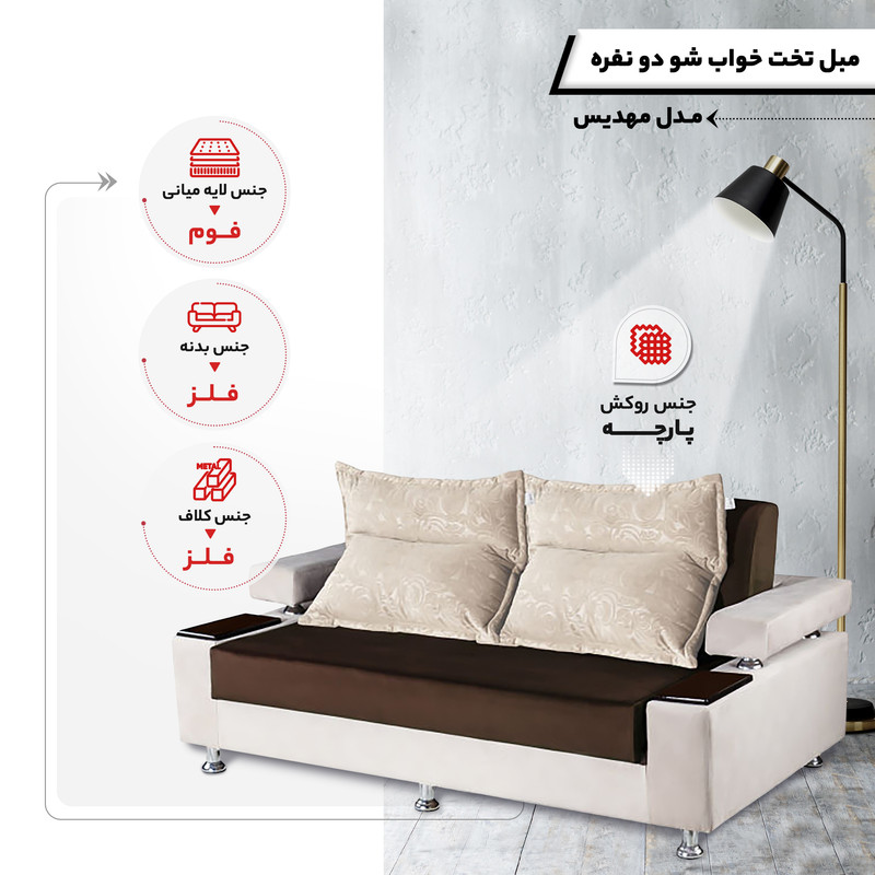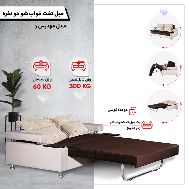 مبل تختخواب شو دو نفره مدل ، راهحلی عالی برای کسانی است که بهدنبال گزینهای راحت و همهکاره راحت برای نشستن و خواب هستند. این مبل تختخواب شو میتواند در طول روز فضایی راحت برای نشستن یا استراحت کوتاه وسط روز فراهم کند و شبها به یک تخت راحت برای خوابی خوب تبدیل شود. پارچه های مبل و متکاها از جنس درجه یک خارجی تولید شدهاند و تشک آن، از اسفنج مرغوب سی کیلویی و طبی ساخته شده که هم محکم و بادوام است و هم برای خوابی راحت کاملا مناسب است. طراحی شیک و مدرن مبل مکمل هر سبک دکوری است و مطمئناً زیبایی کلی فضای شما را افزایش میدهد. مبل تختخواب شو دارای مکانیزم سادهای است که به شما این امکان را میدهد تا تنها در چند ثانیه آن را به تخت تبدیل کنید و برای مهمانان غیرمنتظره یا کسانی که میخواهند از فضای کوچک نهایت استفاده را ببرند، گزینهای ایدهآل است. با اندازه جمع و جور و طراحی سبک وزن، جابهجایی و نگهداری آن آسان است.