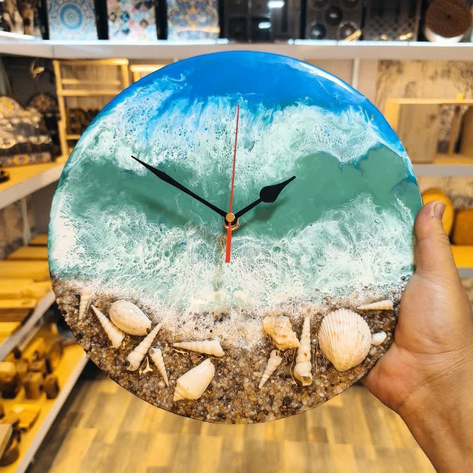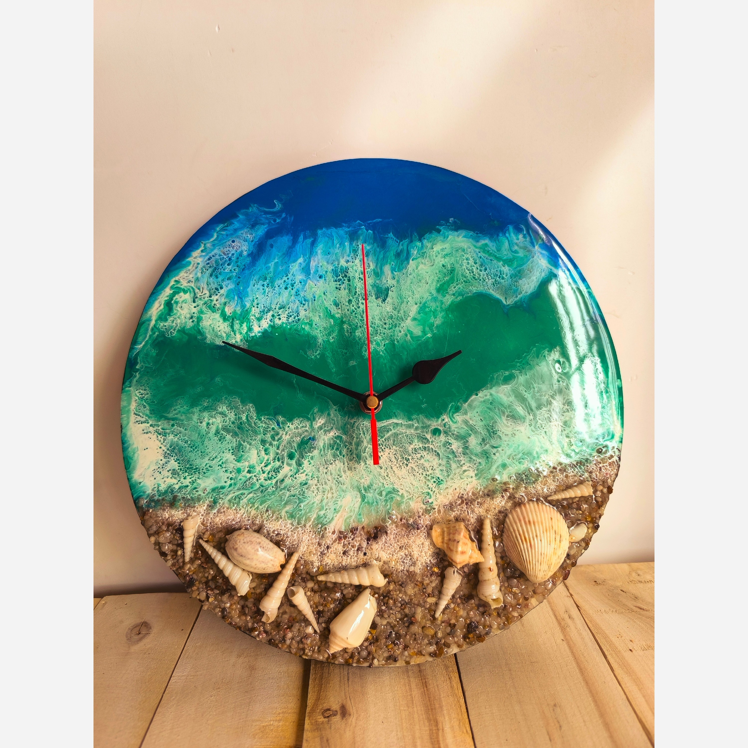ساعت رزینی ساخته شده از بهترین رزین اپوکسی کره ای کاملا مطابقت با طبیعت ساحل ودریا به گونه ای طراحی شده که با دیدنش به دیوار لذت میبرید گوش ماهی،انواع صدف طبیعی،شن طبیعی دریا این ساعت رو به جذابترین درنوع خودش کرده قطر این ساعت 30سانت میباشد وبا بهترین موتور اسمبل شده است عقربه های فلزی مشکی براق رو کار سوار هستند تا گذر زمان رو به بهترین شکل ممکن نشان دهند