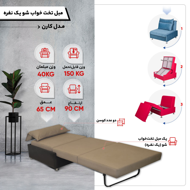 مبل تخت خواب شو یک نفره دارای تشکی از جنس اسفنج با دانسیته بالا است، لولههای به کار برده شده در کف و پایهها تماماً آبکاری شده است که استحکام و دوام خوبی به آن بخشیده است و همچنین برای خوابی راحت کاملا مناسب است. طراحی شیک و مدرن مبل مکمل هر سبک دکوری است و مطمئناً زیبایی کلی فضای شما را افزایش میدهد. مبل تخت خواب شو راهحلی عالی برای کسانی است که بهدنبال گزینهای راحت و همهکاره راحت برای نشستن و خواب هستند. این مبل تختخواب شو میتواند در طول روز فضایی راحت برای نشستن یا استراحت کوتاه وسط روز فراهم کند و شبها به یک تخت راحت برای خوابی خوب تبدیل شود. مبل تختخواب شو دارای مکانیزم سادهای است که به شما این امکان را میدهد تا تنها در چند ثانیه آن را به تخت تبدیل کنید و برای مهمانان غیرمنتظره یا کسانی که میخواهند از فضای کوچک نهایت استفاده را ببرند، گزینهای ایدهآل است. با اندازه جمع و جور و طراحی سبک وزن، جابهجایی و نگهداری آن نیز آسان است.