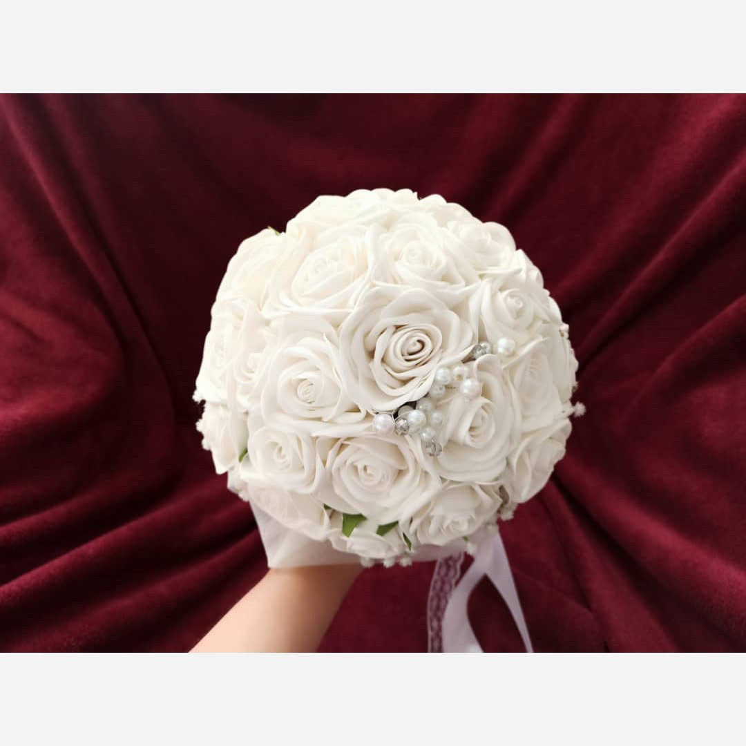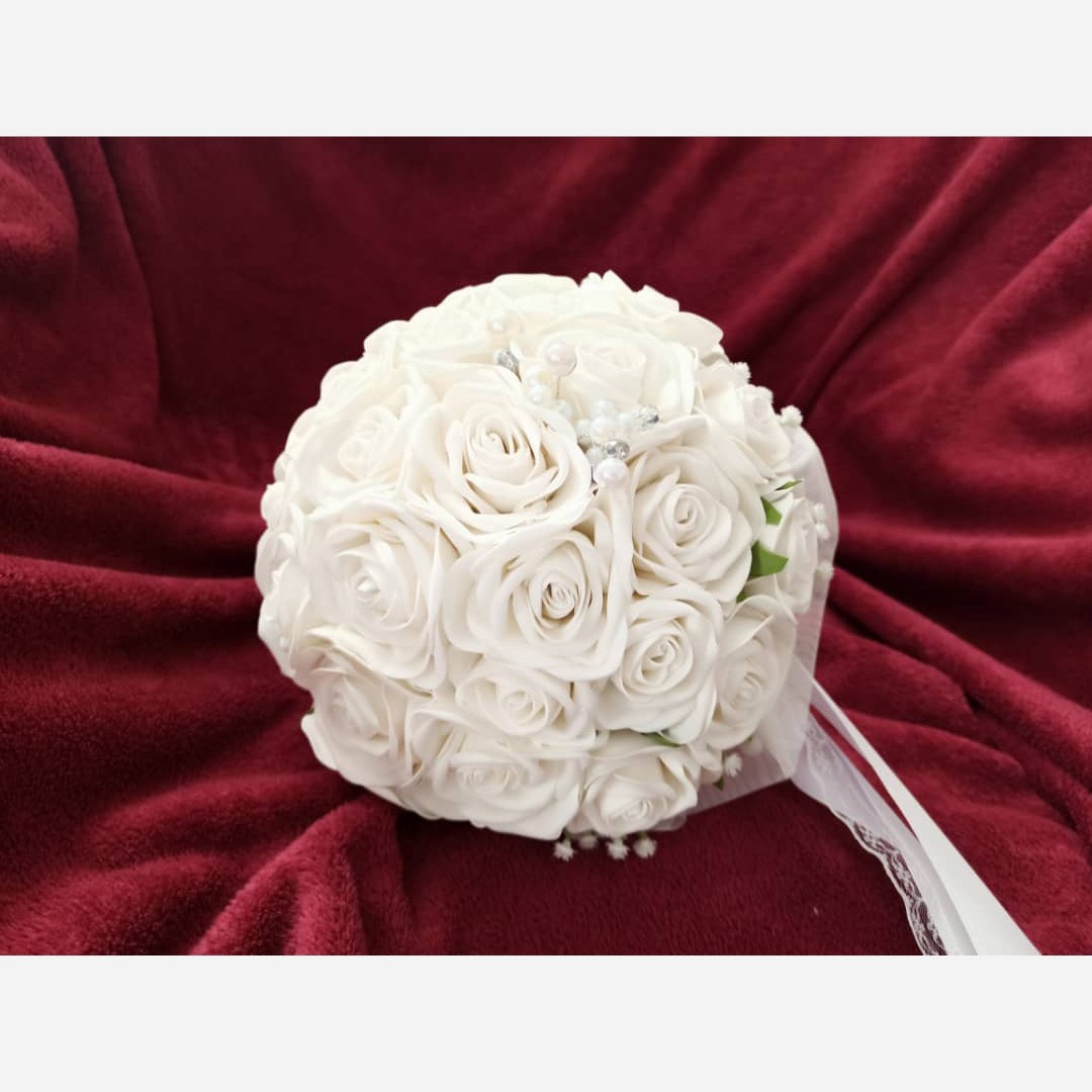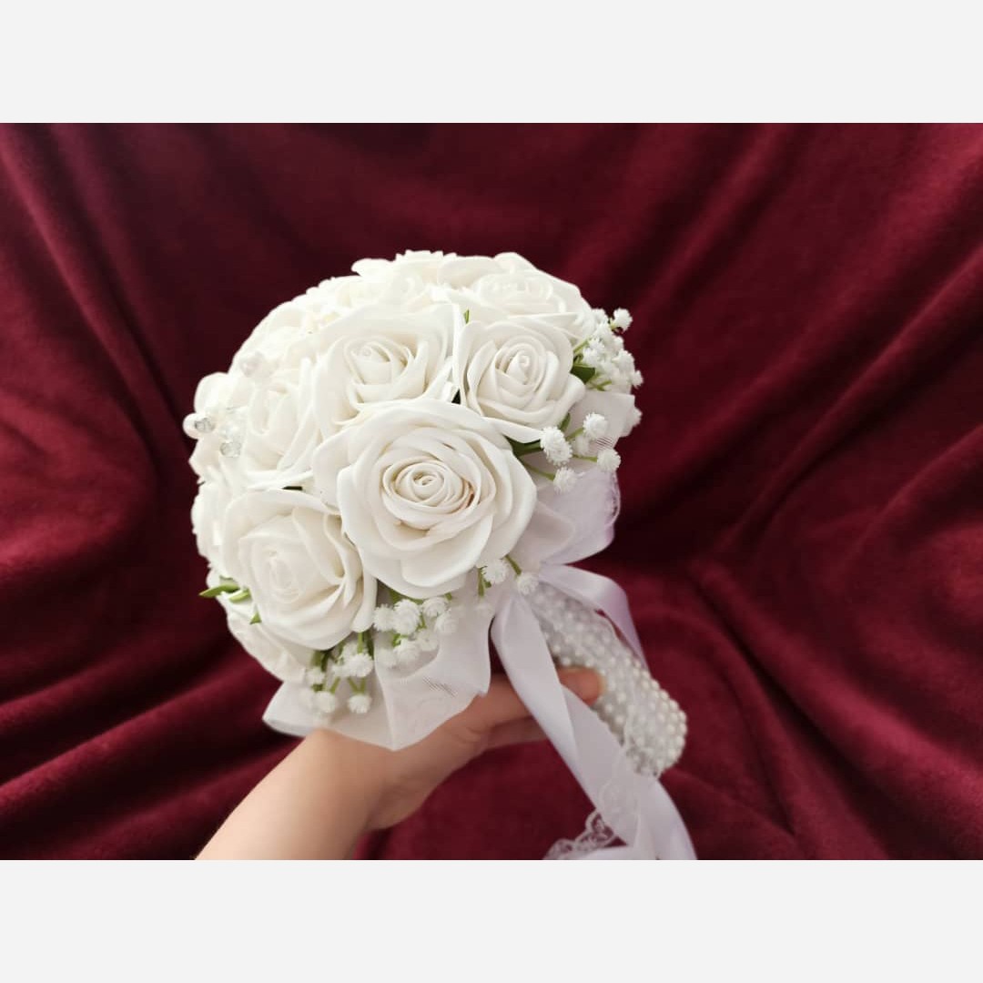 دسته گل عروس با گلهای فومی سفید وتزیین ژیپسوفیلا 💐👰 تزیین شده با تور ومروارید وروبان 🎀 دسته گلی زیبا و ماندگار بعنوان یادگاری از بهترین روزها یک گل کت داماد بعنوان هدیه 🌹🎁 قطر دسته گل 24 سانت میباشد گلها قابل شستشو با آب سرد میباشند