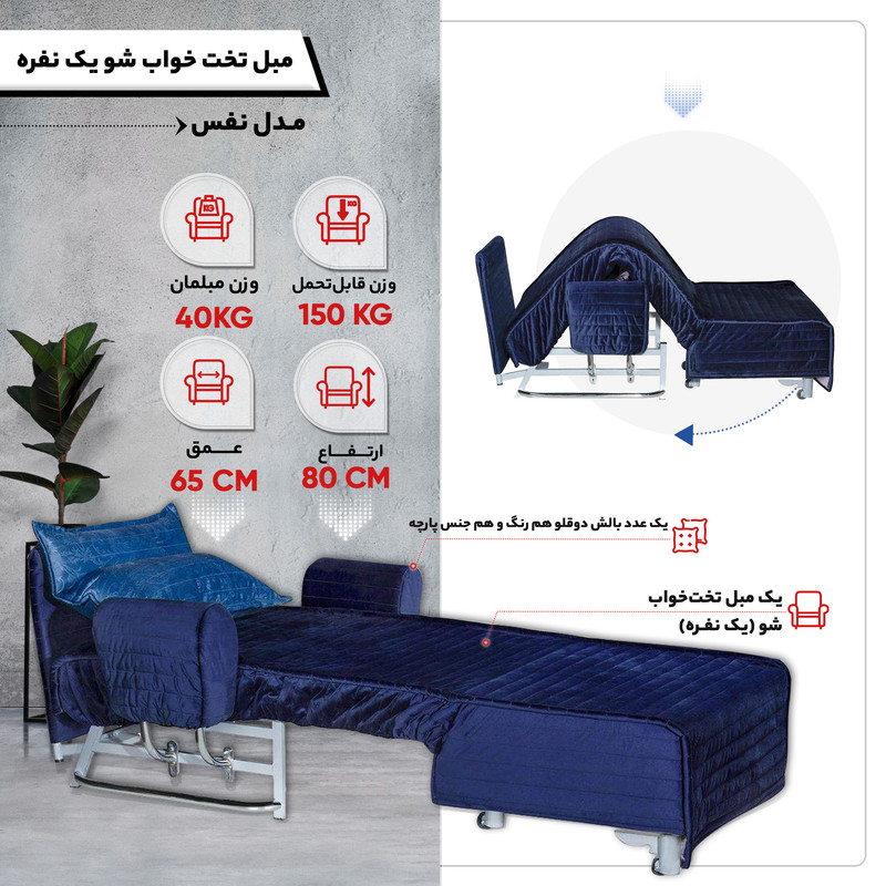 مبل تخت خواب شو یک نفره از پارچه خارجی زیبا و شیک تهیه شده و بهصورت دولایه لایکودوزی شده که باعث میشود مایعات ریخته شده روی پارچه به تشک نفوذ نکند و هم در برابر شستوشوی زیاد مقاوم تر باشد. همراه این مبل یک عدد متکای دوقلو همرنگ و از جنس همان پارچه قرار دارد که با الیاف ویسکوز پر شده است. طراحی شیک و مدرن مبل مکمل هر سبک دکوری است و مطمئناً زیبایی کلی فضای شما را افزایش میدهد. مبل تخت خواب شو راهحلی عالی برای کسانی است که بهدنبال گزینهای راحت و همهکاره راحت برای نشستن و خواب هستند. این مبل تختخواب شو میتواند در طول روز فضایی راحت برای نشستن یا استراحت کوتاه وسط روز فراهم کند و شبها به یک تخت راحت برای خوابی خوب تبدیل شود. مبل تختخواب شو دارای مکانیزم سادهای است که به شما این امکان را میدهد تا تنها در چند ثانیه آن را به تخت تبدیل کنید و برای مهمانان غیرمنتظره یا کسانی که میخواهند از فضای کوچک نهایت استفاده را ببرند، گزینهای ایدهآل است. با اندازه جمع و جور و طراحی سبک وزن، جابهجایی و نگهداری آن نیز آسان است.