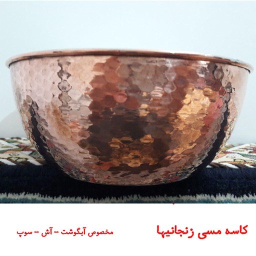 کاسه مسی چکش کاری شده زنجان مسگری یکی از صنایع دستی قدیم ایران است که قدمت آن به چند هزار سال قبل می رسد. امروزه ظروف مسی دارای طرفداران بسیاری است و بسیاری از افراد از این ظروف در آشپزخانه و به عنوان دکوری استفاده می کنند.از فواید این ظروف میتوانند به دارا بودن خواص پزشکی ، طول عمر بالا و مقاوم بودن و.... اشاره کرد.علاوه بر آن می توان به زیبا بودن و اصیل بودن آن اشاره کرد. این کاسه مسی با ظرافت و زیبایی خاصی ساخته شده و چکش کاری بی نظیری دارد.