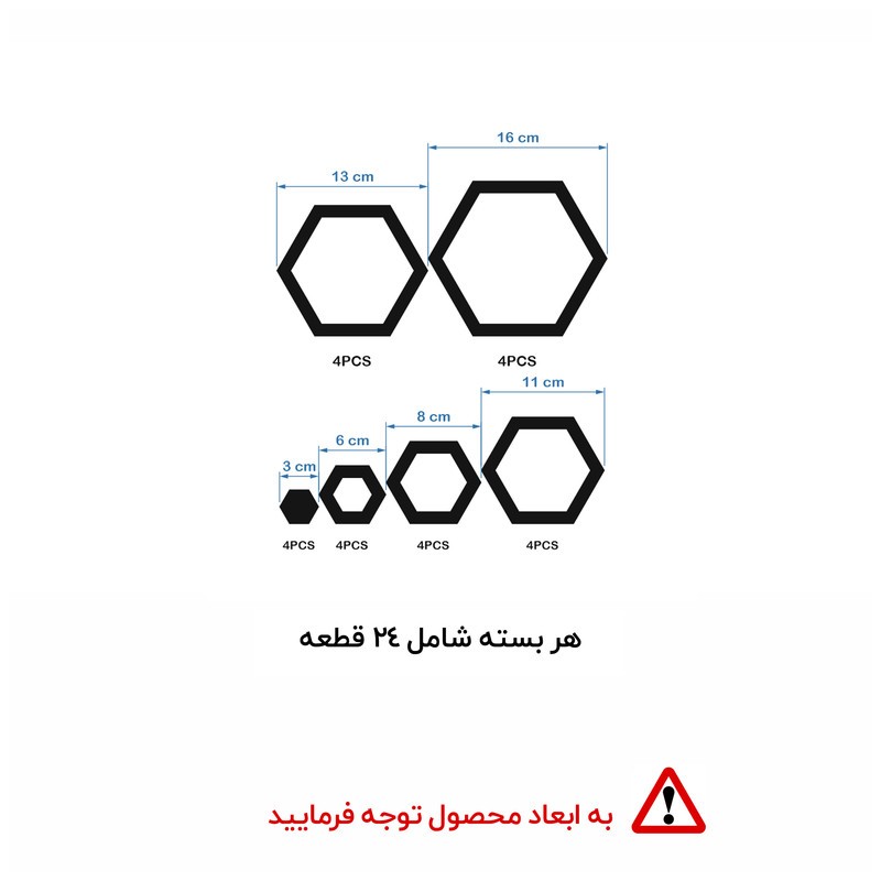 آینه دکوراتیو «Dekorativ» طرح لانه زنبور یک انتخاب عالی برای تزئین دیوارهای خالی است . این مجموعه آینه شامل 24 قطعه آینه طرح شش ضلعی در شش سایز میباشد که به کمک آن میتوانید طرح های متنوعی روی دیوار اجرا نمایید . این محصول روی کلیه سطوح از کابینت و کمد دیواری گرفته تا سقف و کاشی و شیشه قابل نصب است. در ضمن این محصول قابلیت نصب در محیط های مرطوبی مانند سرویس بهداشتی و حمام را نیز داراست. جنس آینه این محصول، پلکسی گلس براق فوق سبک است که در زمان دریافت، روکش مات ضدخش روی قطعات آن وجود دارد. برای مشاهده انعکاس کامل آینه، روکش را با کمک ناخن از روی سطح آینه جدا نمایید. به منظور نصب محصول روی تمامی سطوح، تنها کافیست که روکش چسب پشت آینه را بردارید. ذکر این نکته ضروری است که برای جابجایی آینه بدون صدمه به دیوار، این چسب به کمک حرارت سشوار قابل جدا سازیست.