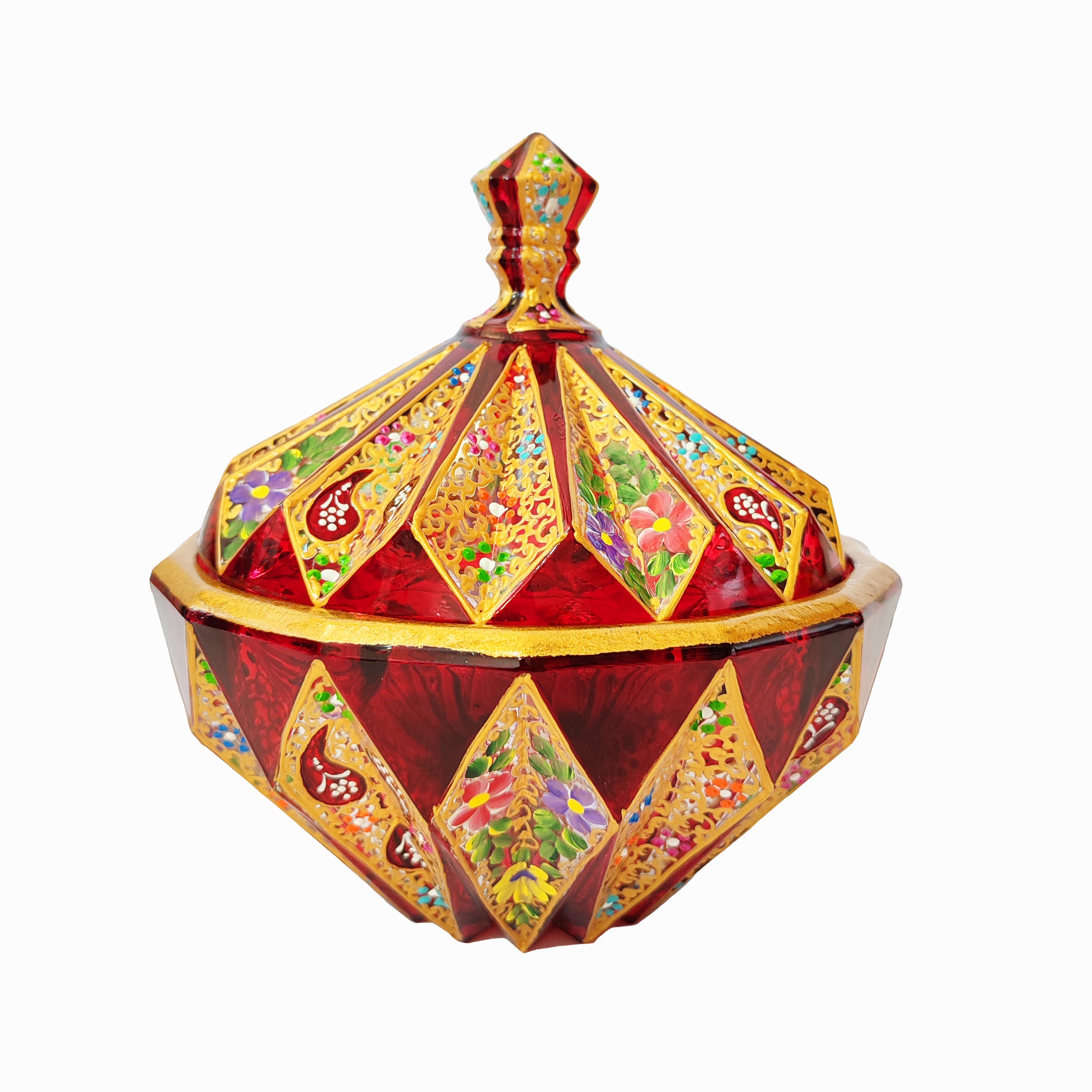 شکلات خوری بلور نقاشی مدل گل و ترمه جزو خاص ترین و جدیدترین کارهای گالری پرند هست که به طور انحصاری توسط ما در سه رنگ آبی، قرمز و سبز نقاشی می شود. این محصول درب دار و کاملا قابل شست و شوی معمولی می باشد و علاوه بر استفاده ی دکوری می تواند بهترین گزینه برای پذیرایی از میهمانان شما باشد. همچنین می تواند کادویی منحصر به فرد برای دوستان و عزیزانتان باشد.