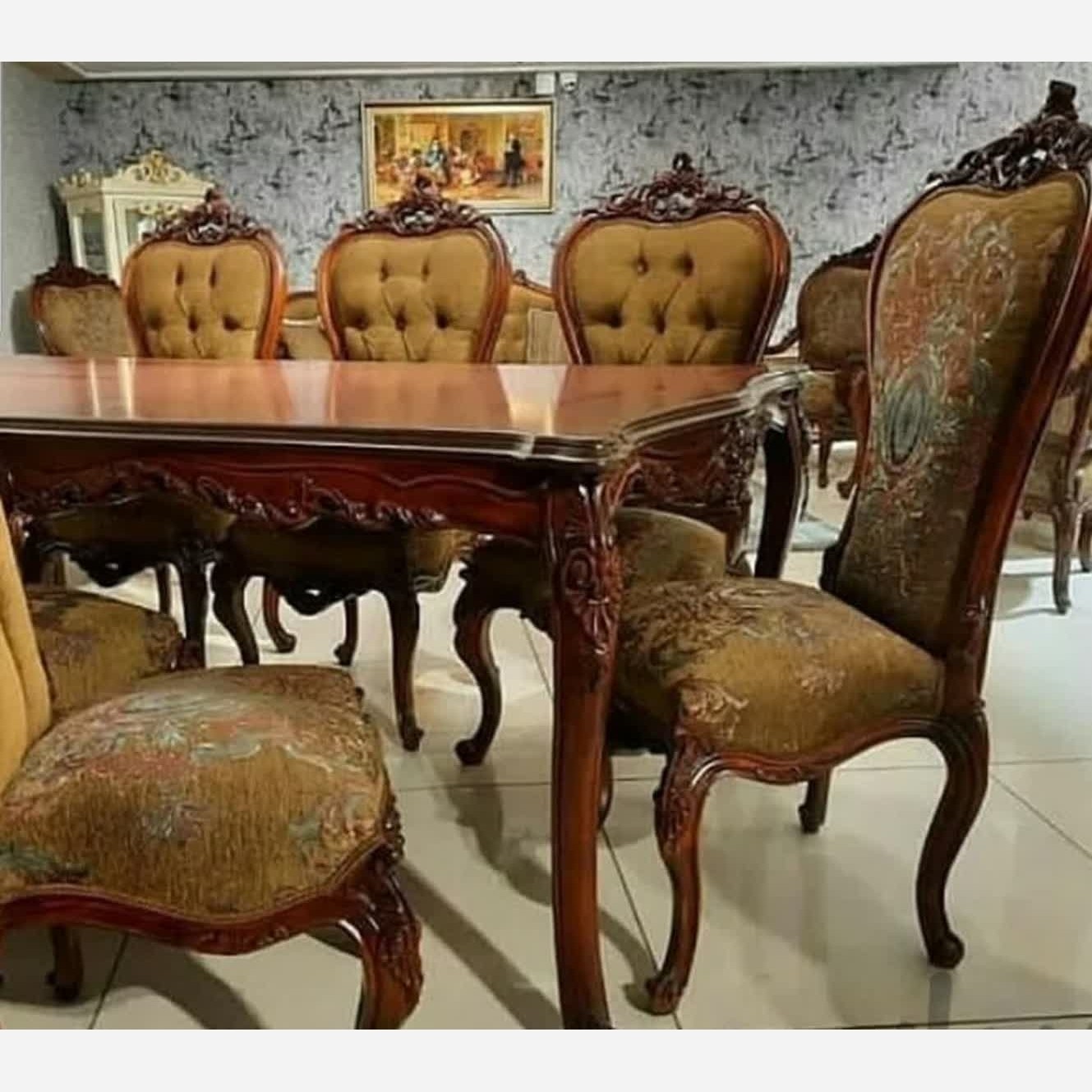 میز غذا خوری کلاسیک مدل لیون : 💰4 نفره:56میلیون 💰6 نفره:78میلیون 💰8 نفره:95میلیون مشخصات: چوب راش گرجستان پارچه خارجی و درجه یک فوم سرد14 سانتی رنگ پلی یورتان رنگبندی چوب و پارچه به سلیقه مشتری ارسال از طریق باربری به سراسر کشور