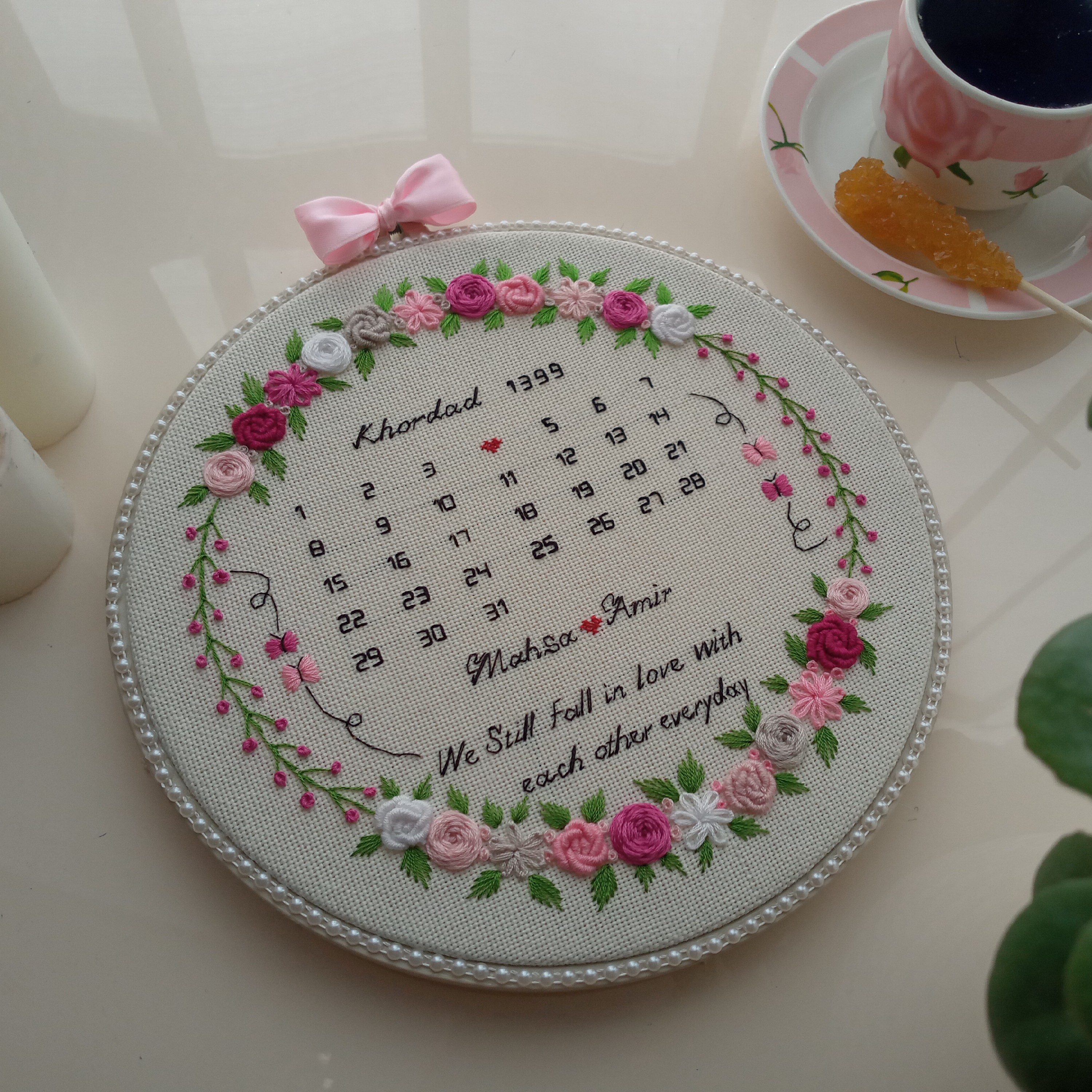 دیوار کوب تقویمی تولد شما میتونید تاریخ تولد و رنگ های نخ مد نظرتون رو اعلام بفرمایید و طبق خواسته شما طرح زده میشه و دوخت انجام میشه