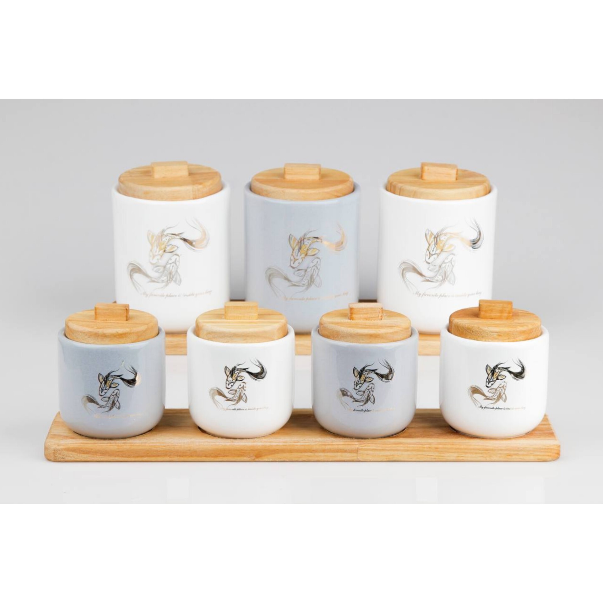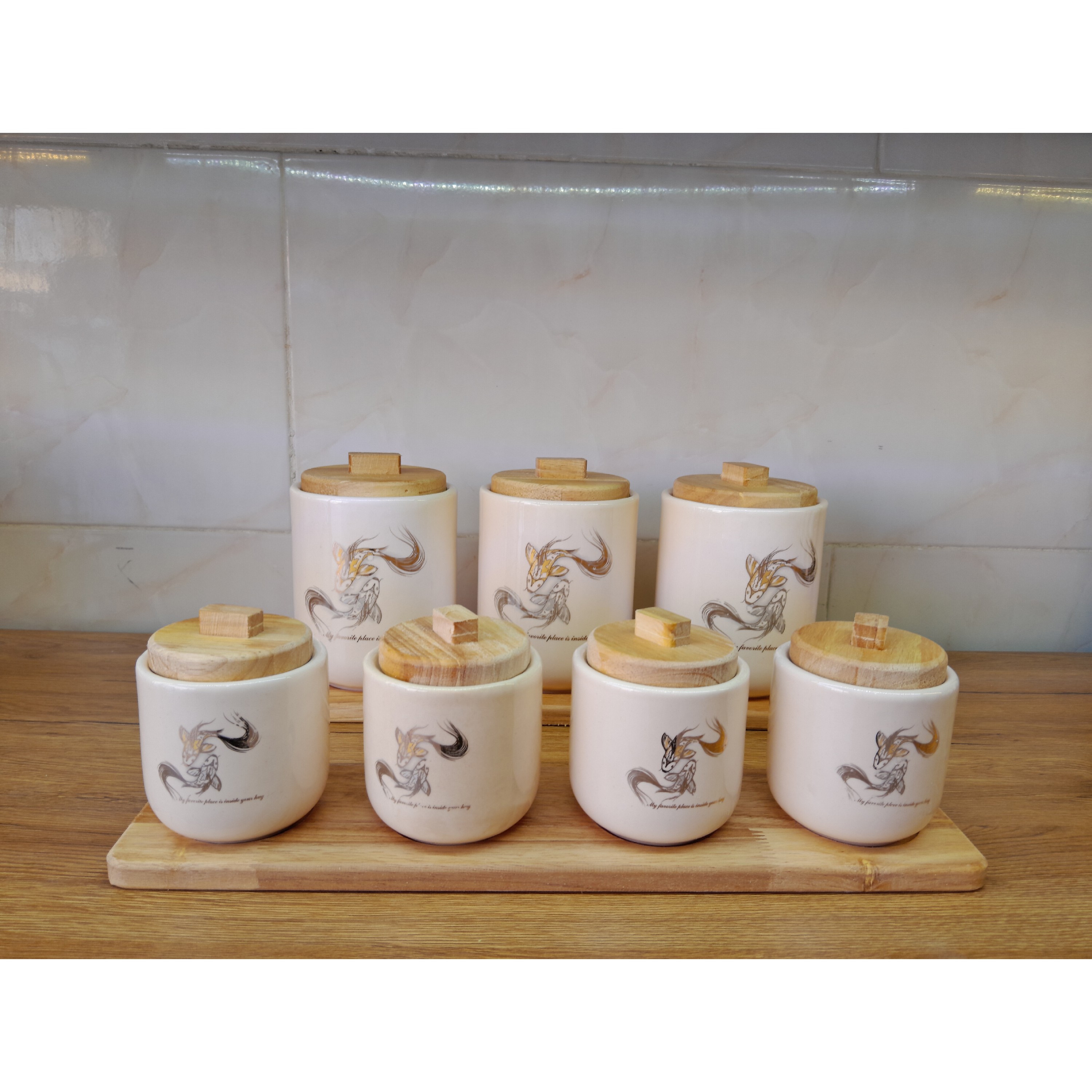 این سرویس هفت پارچه شامل : چهار عدد جا ادویه و 3عدد بانکه میباشد به همراه استند چوبی