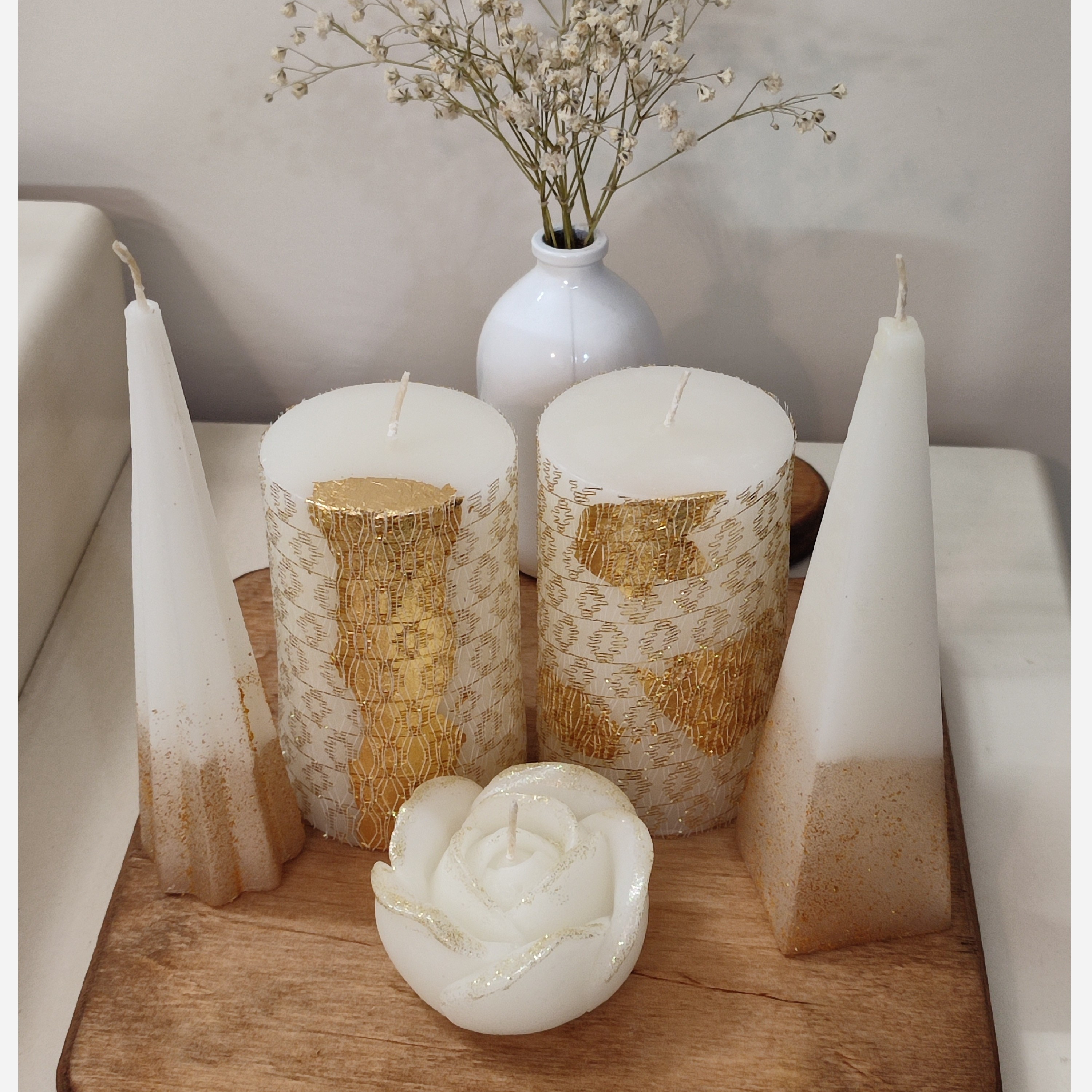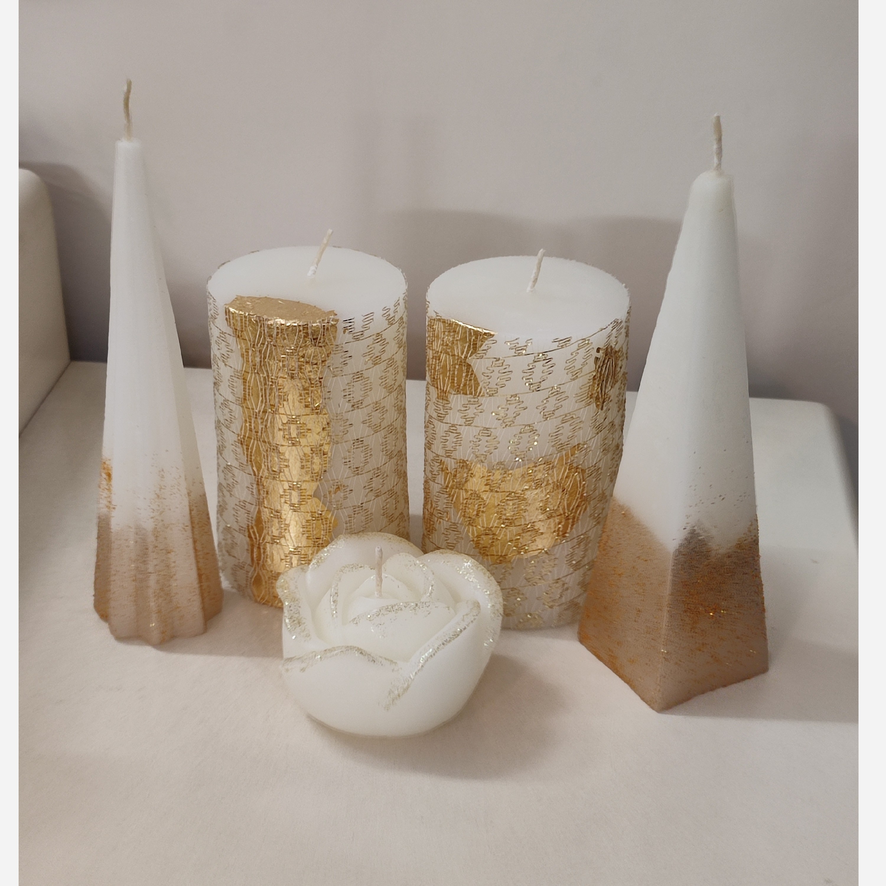 شمع 5عددی طلایی اکلیلی استوانه وهرمی وگل مبلمونسرا مدل 283550