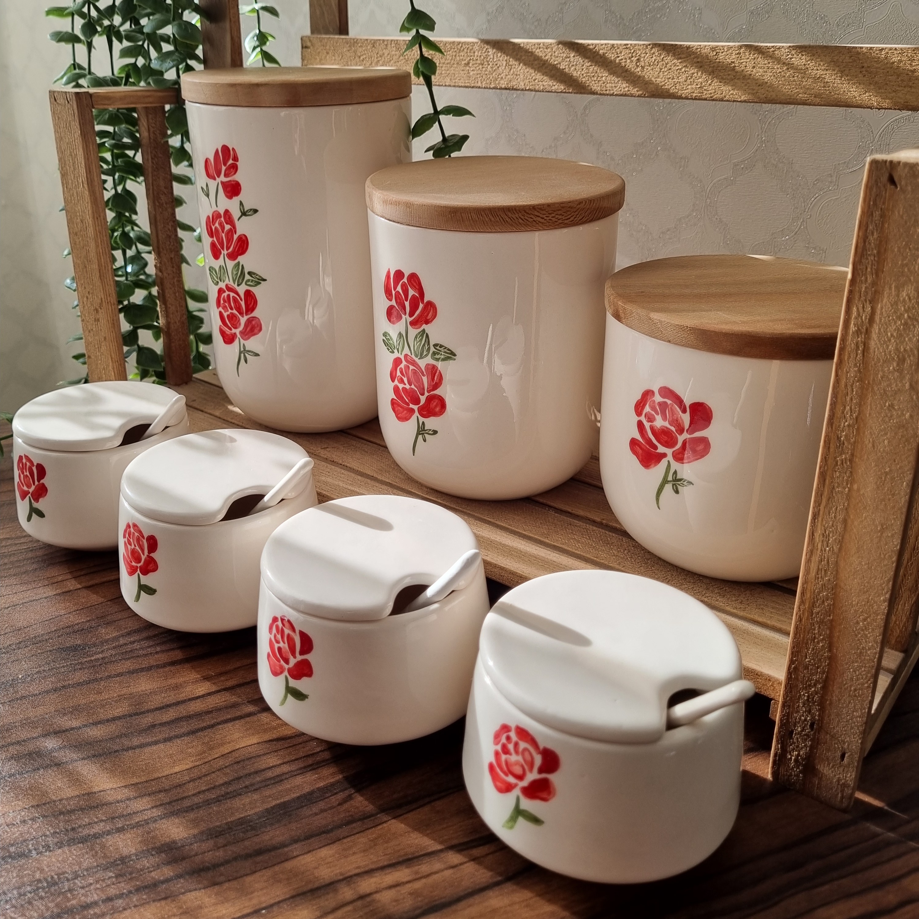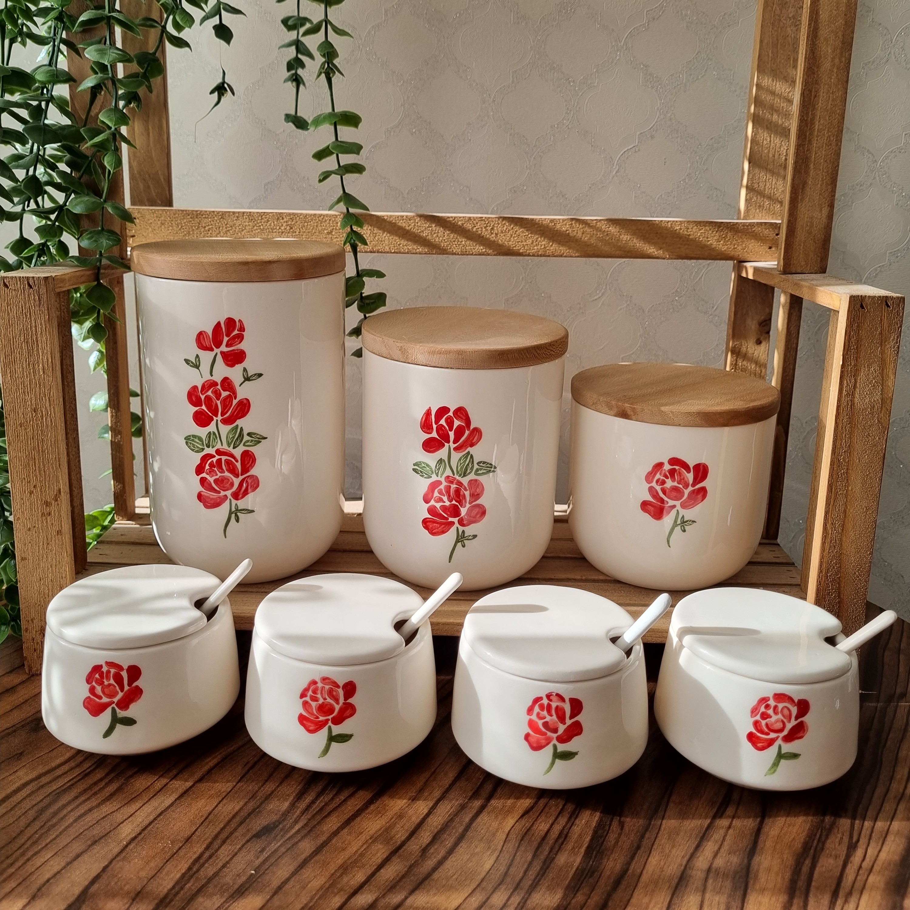این ست شامل سه عدد بانکه با در چوبی و چهار عدد جاادویه قاشق دار با در سرامیکی و چوبی می باشد جاادویه قابل سفارش یا در چوبی هست که در صورت ثبت سفارش بفرمایید که با در سرامیکی ارسال بشه یا در چوبی. استند چوبی داخل عکس جز سفارش نمی باشد.
