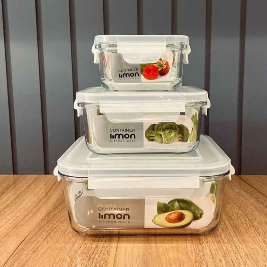 ست ظرف شیشه ای مربع لیمون 6 پارچه دارای نوار سیلیکونی (واشر) برای جلوگیری از ورود هوا که موجب ماندگاری بیشتر مواد غذایی در برابر باکتری میشود و همچنین از جذب و انتشار بوی نامطبوع جلو گیری میکند قابل استفاده در فر تا دمای 230 درجه سانتی گراد قابل استفاده در ماکروفر و یخچال فریزر هشدار : برای استفاده در فر و ماکروفر حتما درب ظرف برداشته شود