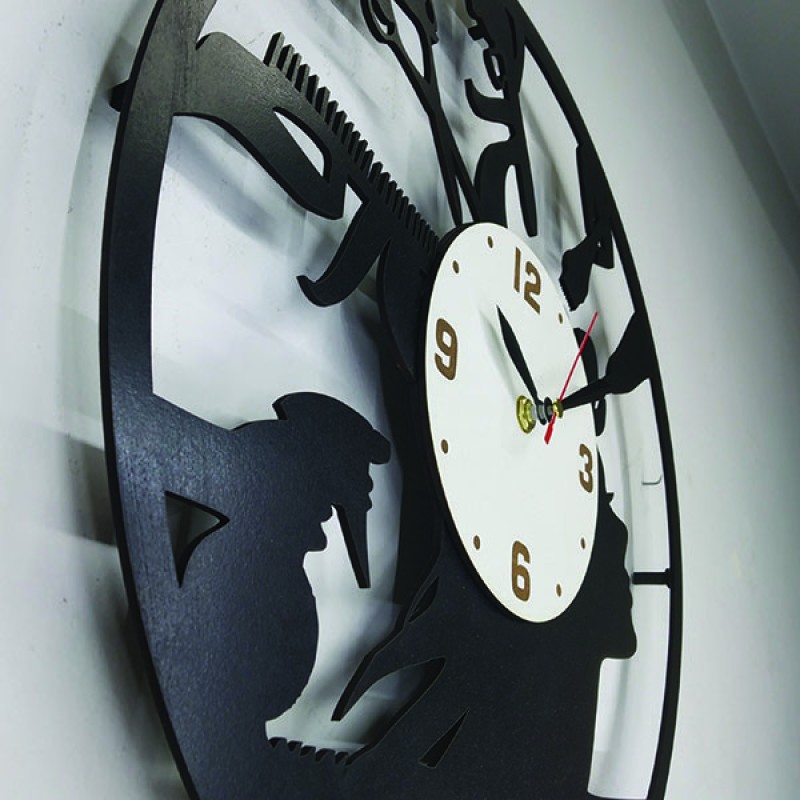 ساعت دیواری طرح آرایشگاه یکی از مدرنترین محصولات دکوراتیو می باشد که جهت زیباسازی محیط آرایشگاه با طراحی 3بعدی مورد استفاده قرار میگیرد که باعث جلب توجه دید مشتریان میشود از این رو استفاده از محصولات دکوراتیو در محیطهای یکنواخت باعث جذابیت بیشتر میشود و استفاده از محصولات باکیفیت آذرلاکچری این امکان را برای شما عزیزان فراهم مینماید. جنس چوبی 3میل مشکی برای بدنه اصلی محصول استفاده شده و صفحه ساعت نیز چوبی 3میل طرحدار با حکاکی شماره جلوه زیبایی به محصول ایجاد کرده و موتور ساعت از جنس تایوانی استفاده شده که صدای بسیار کمی و کیفیت بسیار بالایی نسبت به موتورهای چینی دارد و دارای گیره نگهدارنده جهت نصب آسان روی دیوار می باشد.