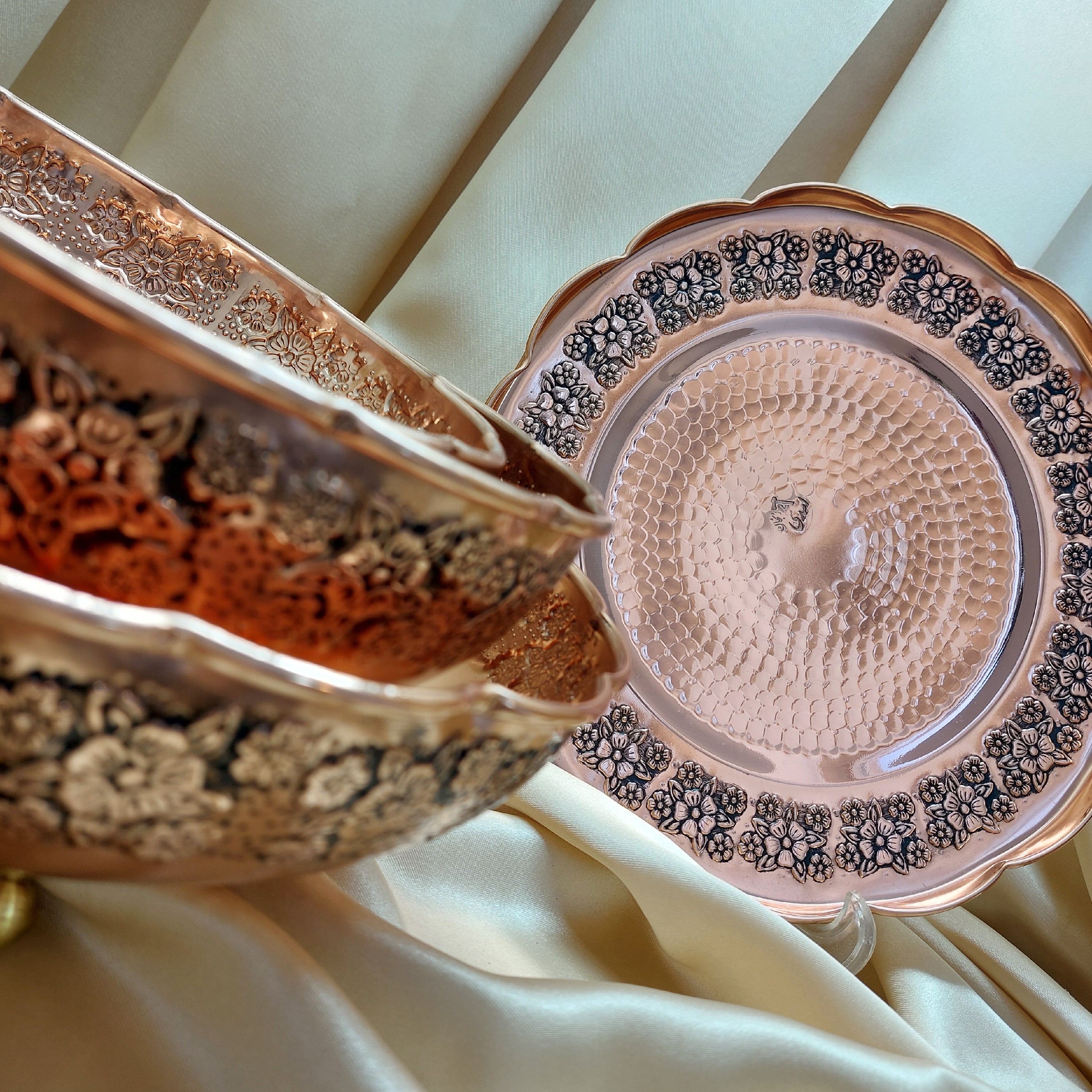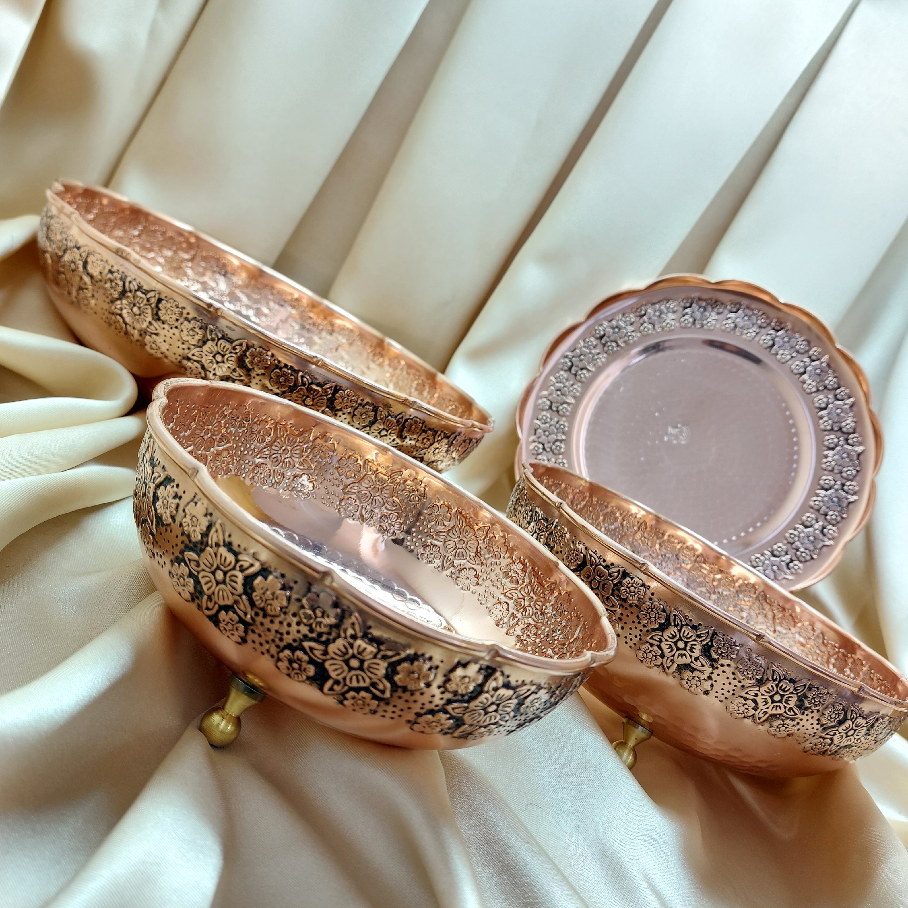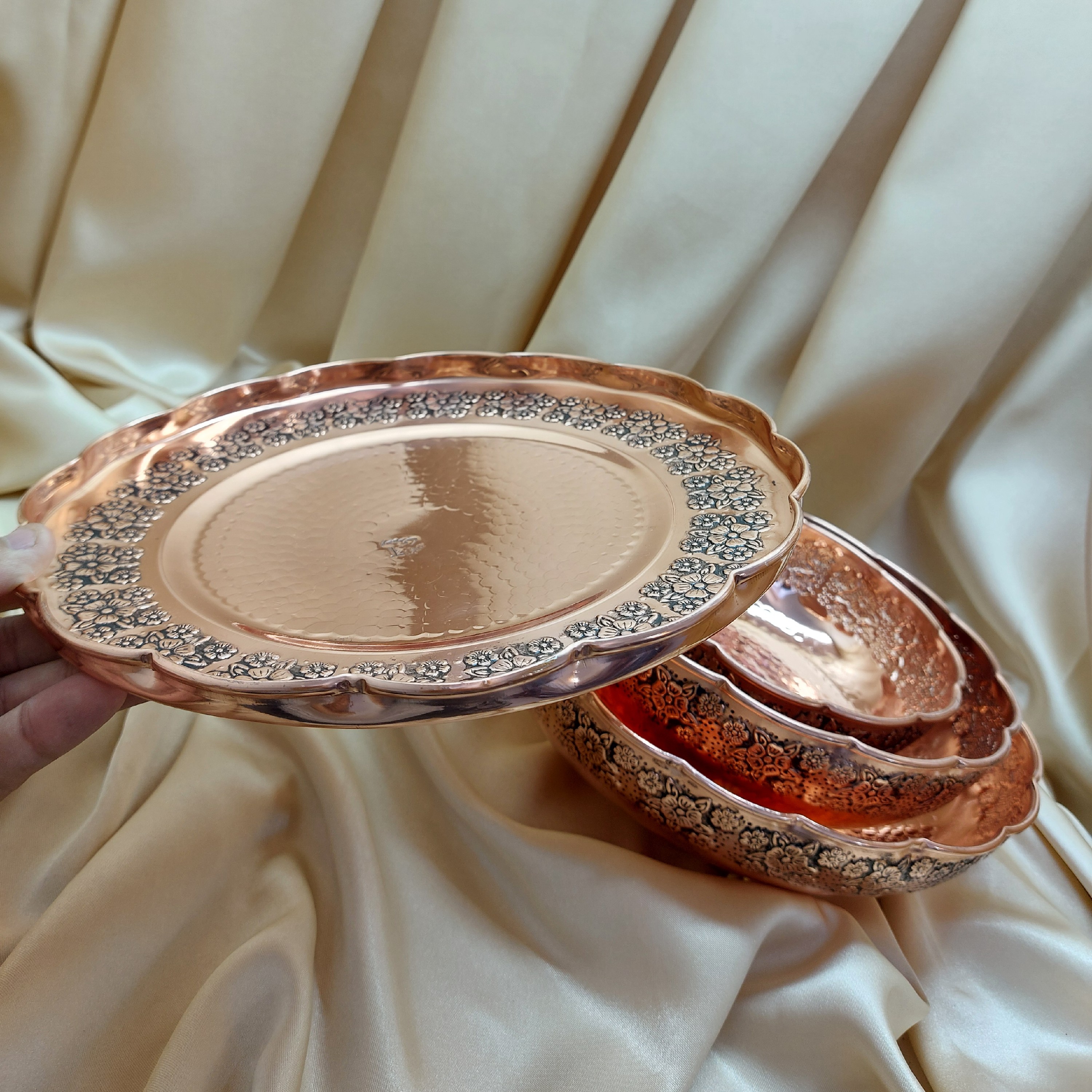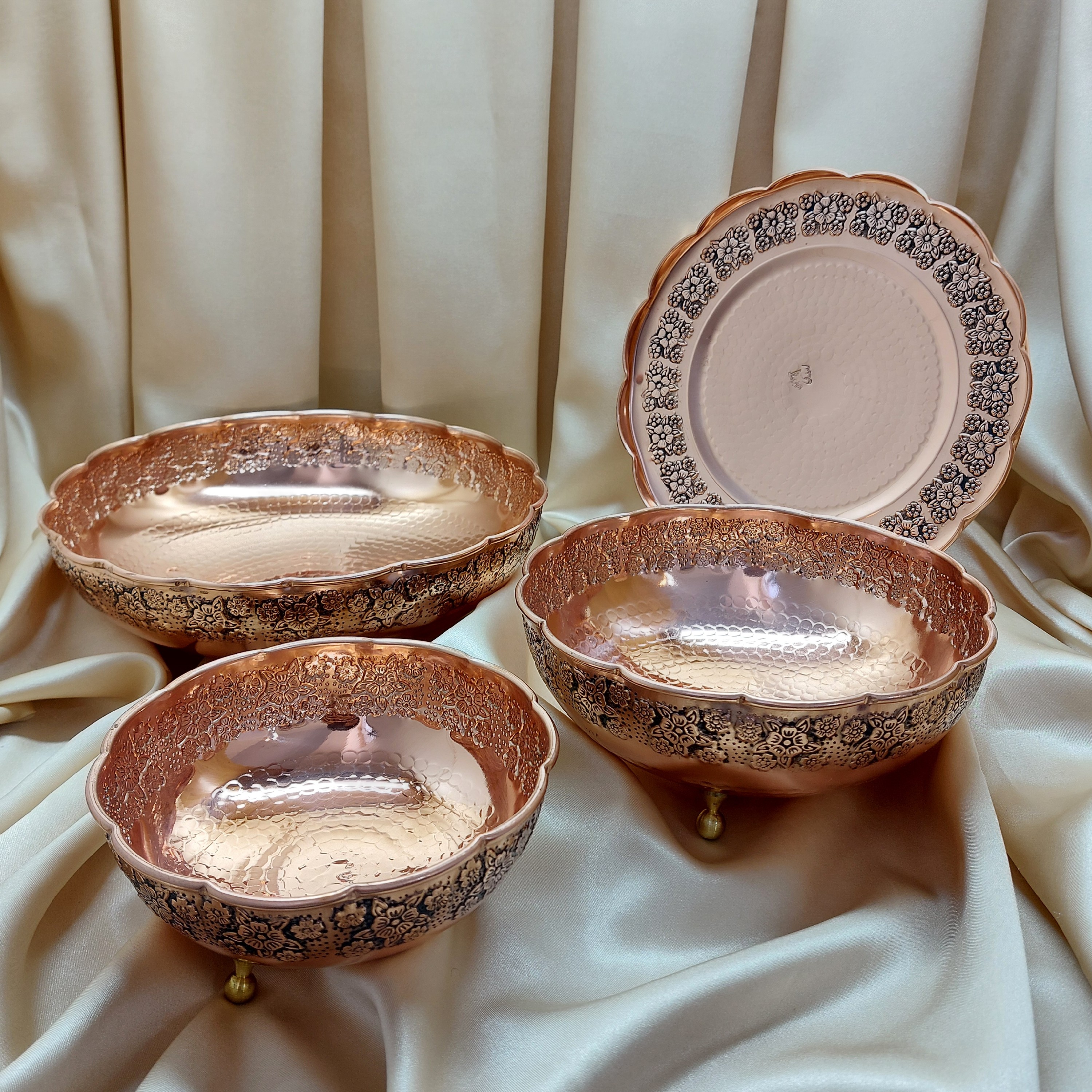 سرویس پذیرایی مسی طرح گلبرگ سه پایه 4 تیکه شامل: میوه خوری: ارتفاع 9 سانت و قطر 28 سانت آجیل خوری: ارتفاع 9 سانت و قطر 22 سانت شیرینی خوری: ارتفاع 5 سانت و قطر 26 سانت شکلاتخوری: ارتفاع 7 سانت و قطر 17 سانت جنس پایه ها از برنج خالص نانو شده و رنگ ثابت کیفیت ساخت عالی چکش کاری ریز و دقیق ساخته شده از ورق ضخیم و سنگین