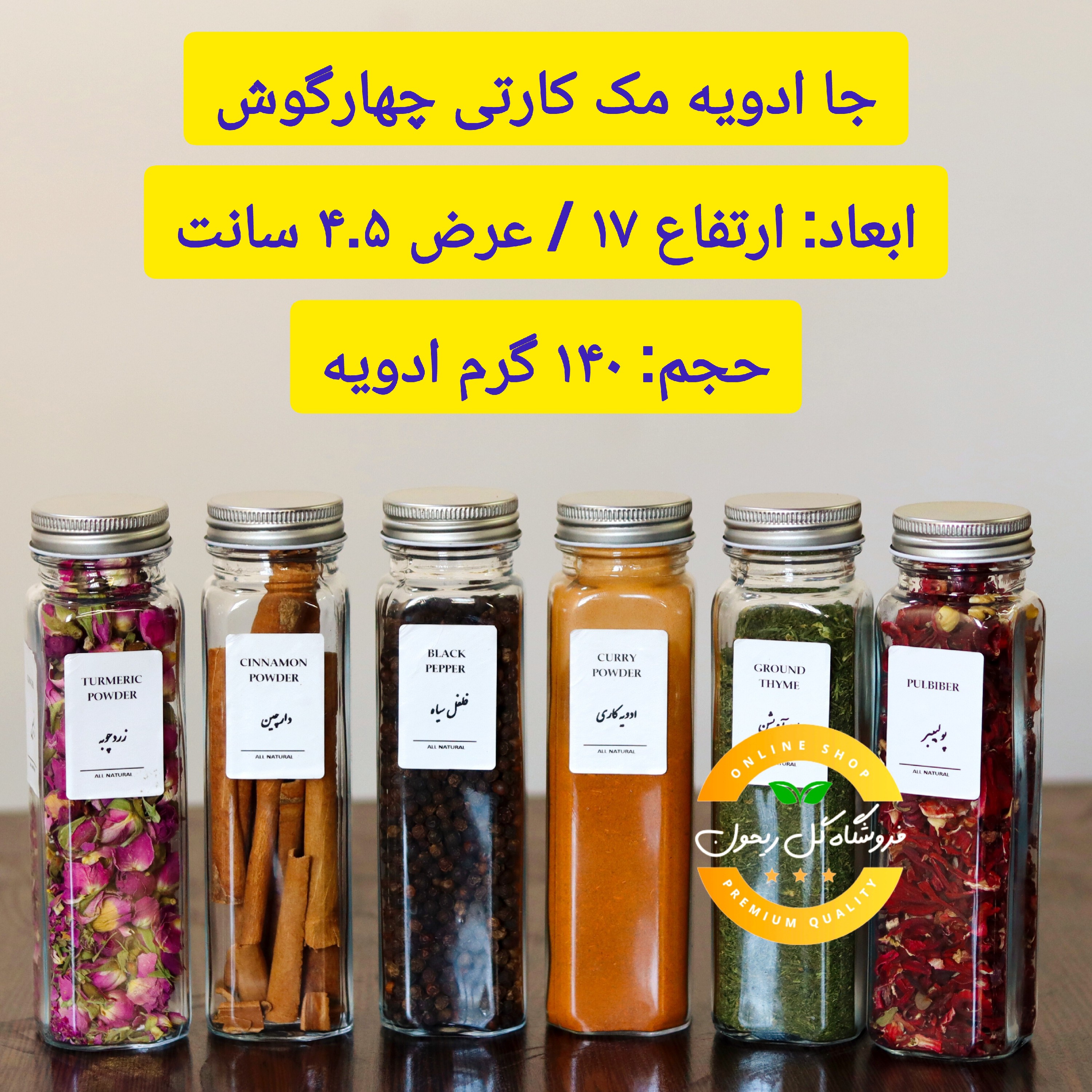 پک شامل: 💥 30 عدد جا ادویه شیشه ای مک کارتی 17 سانتی 💥 5 عدد استند کشویی پلکسی ایرانی، ابعاد هر استند عرض 10 سانت در طول 30 سانت 💥 36 عدد لیبل ضد آب بانوشته / بدون نوشته ابعاد شیشه ها: عرض 4.5 سانت در ارتفاع 17 سانت، قطر دهانه شیشه 4 سانت 💥 در صورتی که درپوش سیلیکونی ادویه پاشی میخواهید، گزینه همراه با درپوش را سفارش دهید. شیشه ها با افتخار تولید ایران میباشند و از شفافیت و کیفیت مطلوبی برخوردارند. نکته: اگه نمیدونید کشوی شما چه تعداد شیشه جا میگیره به ما پیام بدید که راهنماییتون کنیم.