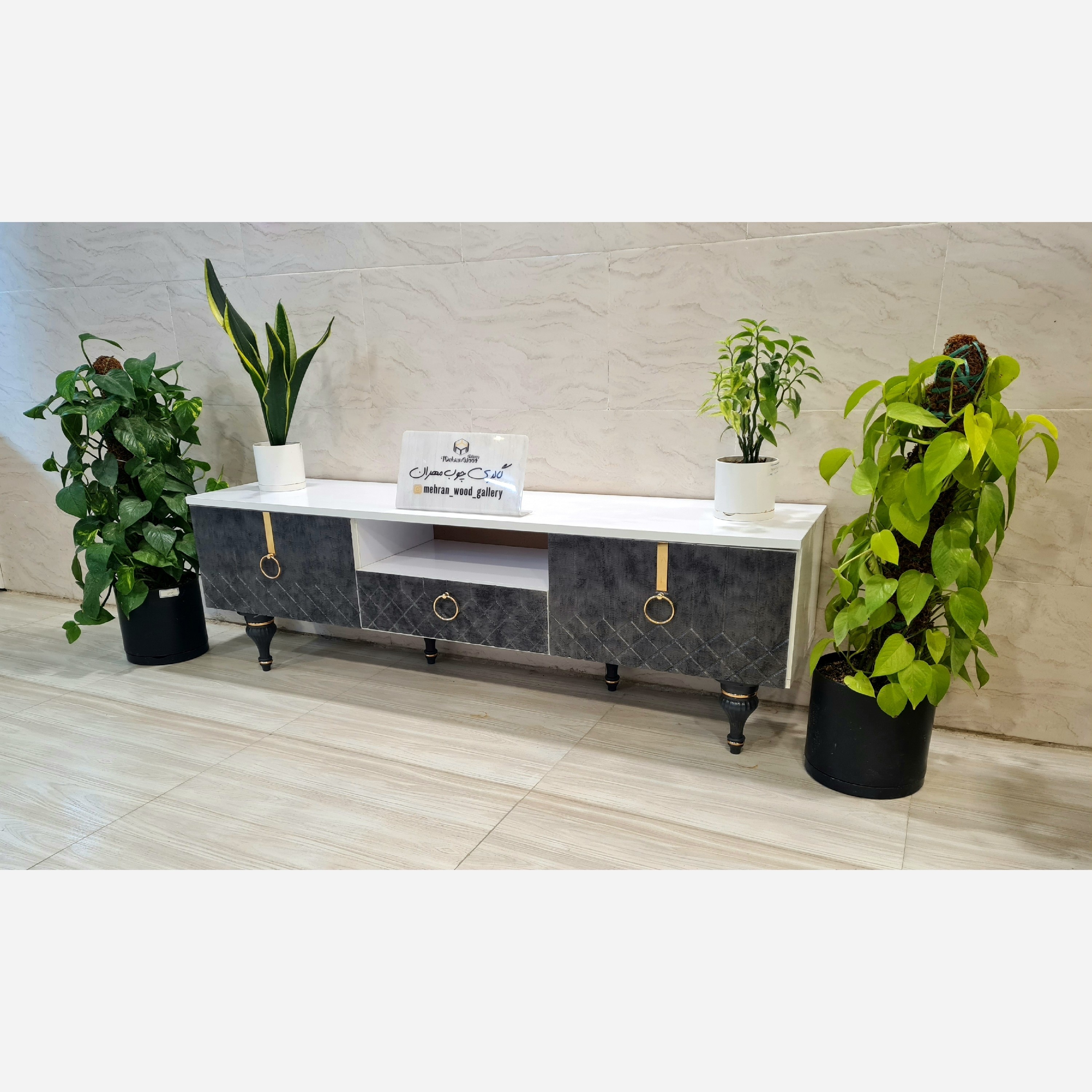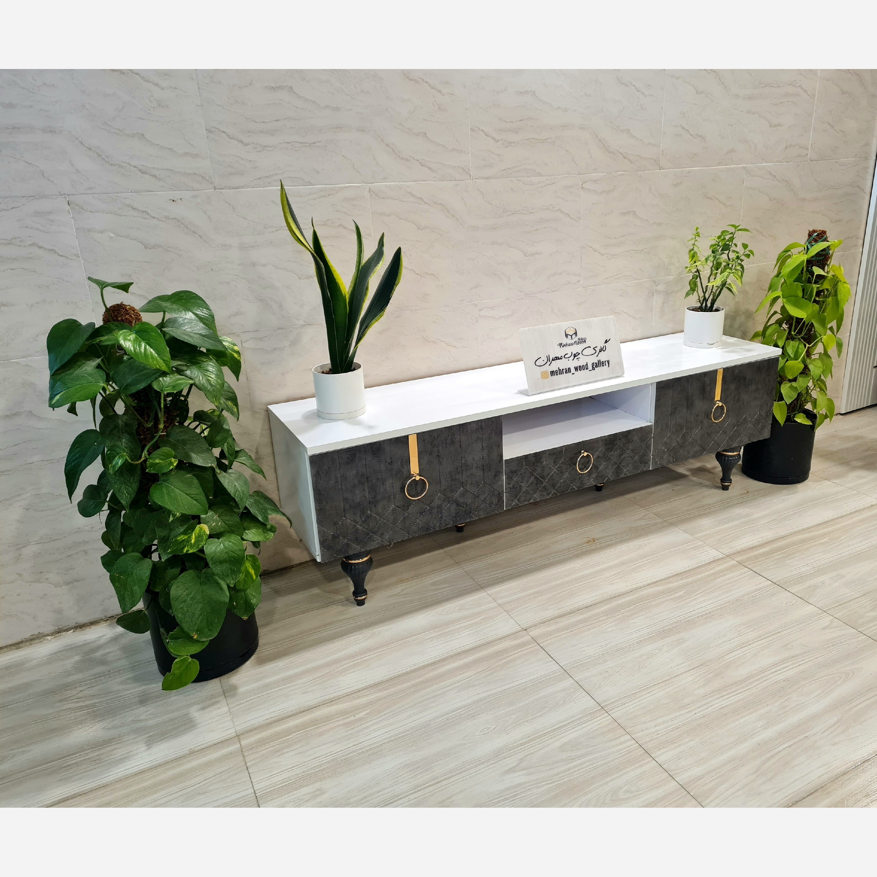 میز تلویزیون مدل رومی در ها وکیوم FRP شرکتی تهران بدنه ملامینه هزینه ارسال با مشتری به کمترین قیمت رنگ زغالی مبلمونسرا مدل 222537