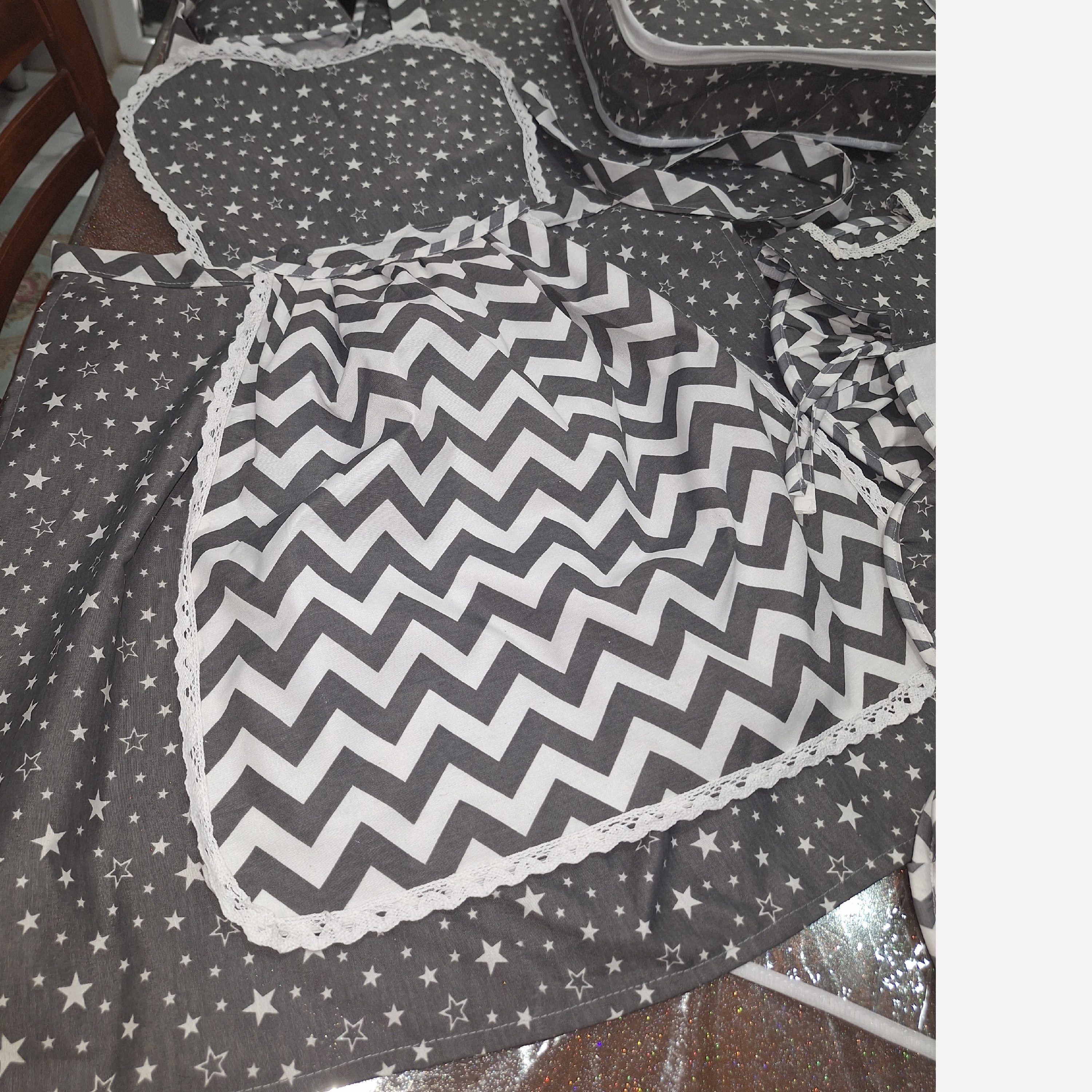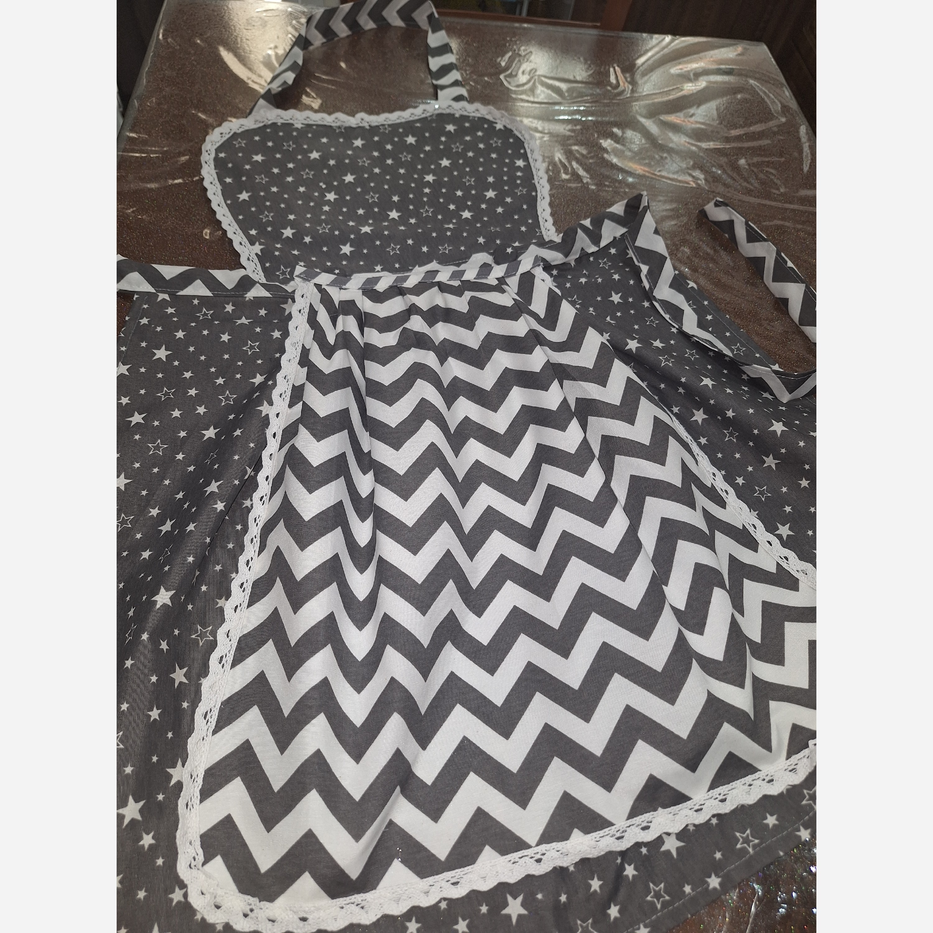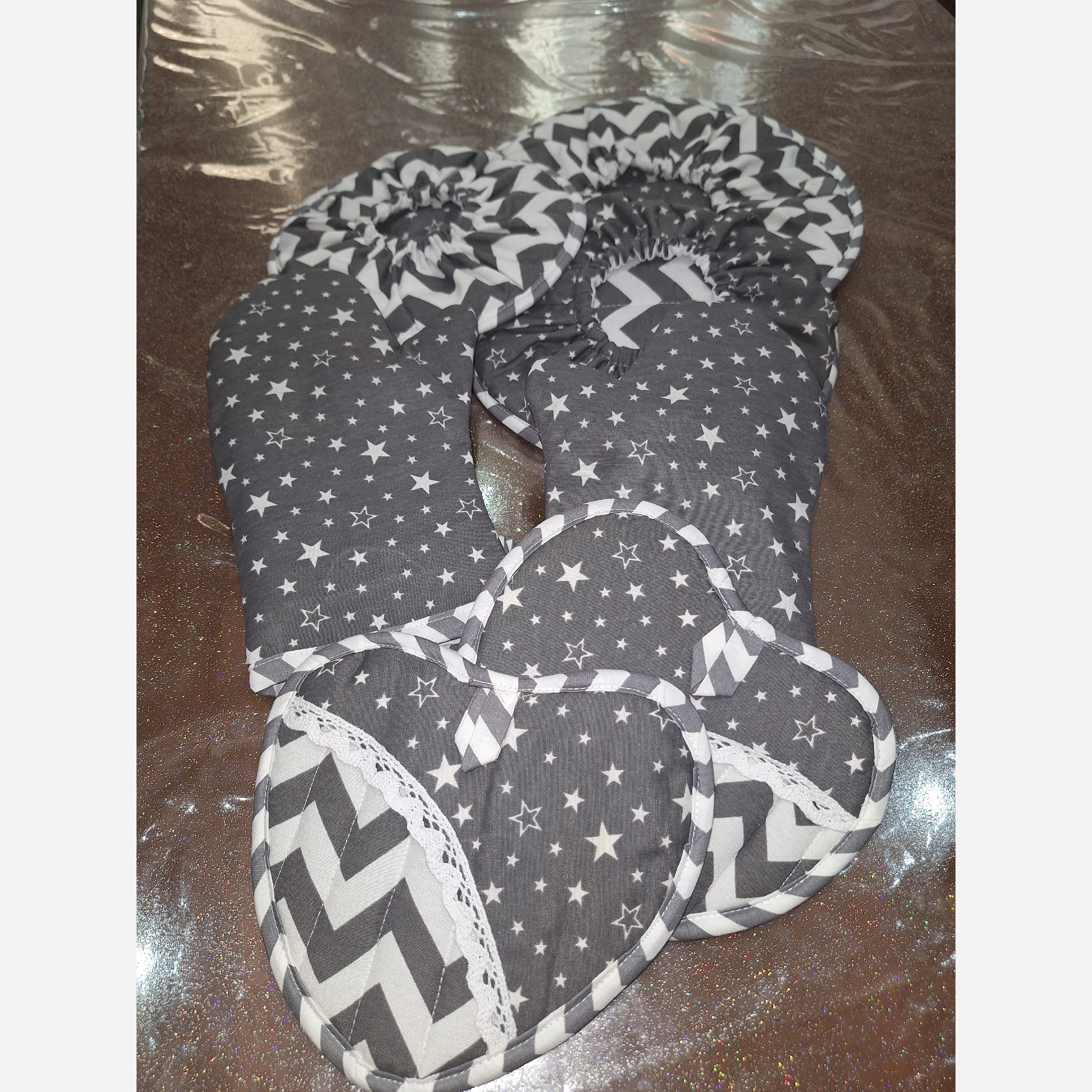سرویس 9 تیکه شامل :4 عدد دمکن از بزرگ به کوچیک دو عدد دستگیره قلب دو عدد دستگیره ساده یک عدد پیشبند دو دامنه با مشما سفره ورنی یک عدد حوله آشپزخانه دو لا حوله ضخیم 4عدد دمکن