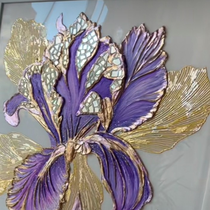 تابلو نقاشی برجسته گل زنبق بنفش آینه کاری شده کار شده با ورق طلا برجسته سازی با خمیر تکسچر سرامیک اجرا روی بوم نقاشی درجه یک کانواس با زوار چوب روس دارای روکش رزین برای مراقبت و شیشه ای شدن زمینه تابلو ابعاد 70×70 رنگ آمیزی شده با رنگ اکریلیک تمامی تابلو های نقاشی غرفه توسط خودم اجرا شده و ژورنالی نیستن