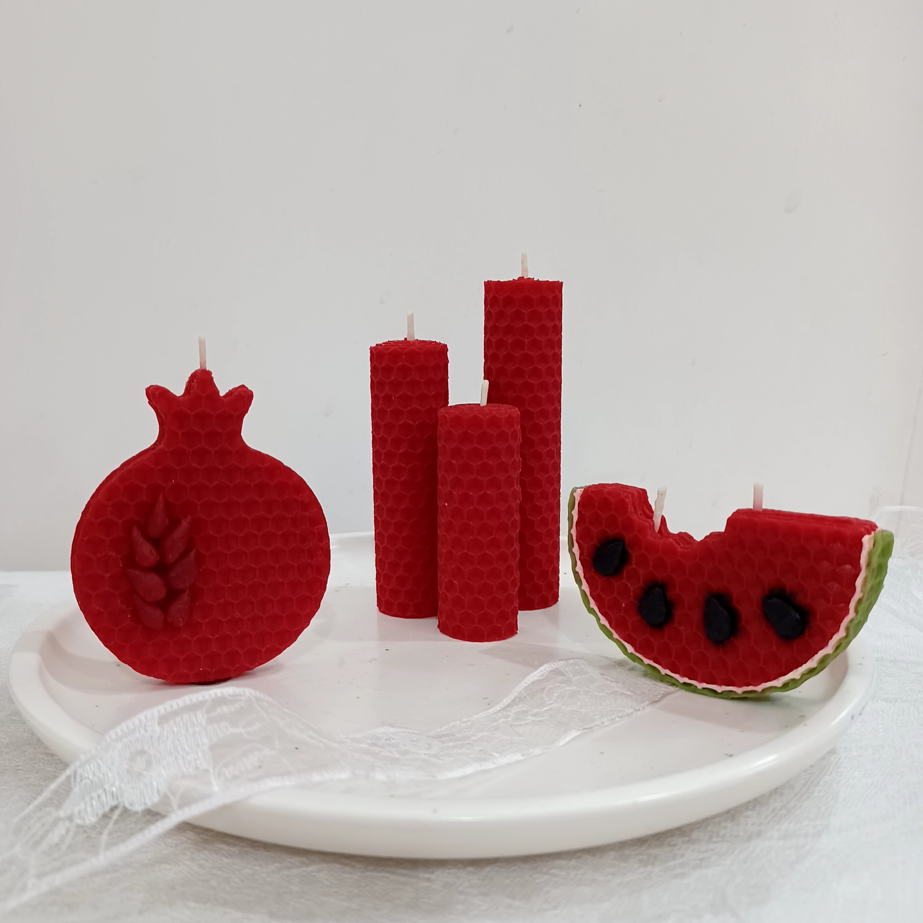 پک یلدایی موم عسل شامل : ♥️شمع سه تایی استوانه ♥️شمع هندوانه ♥️شمع انار 💚شمع های سه تایی ارتفاع 7 ، 9 ، 11 با قطر 2/5 💚شمع هندوانه 8 × 4/5 ضخامت 1 💚شمع انار 8 × 6/5 ضخامت 1