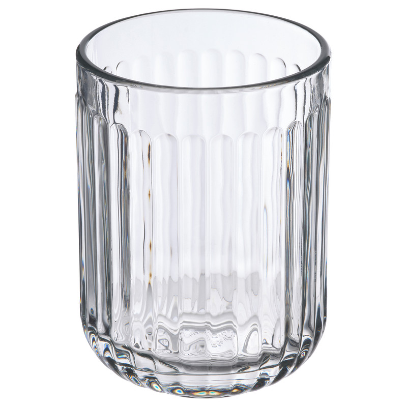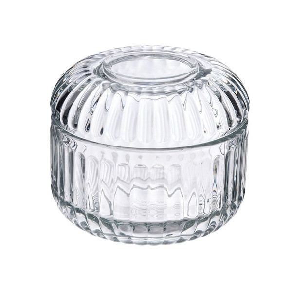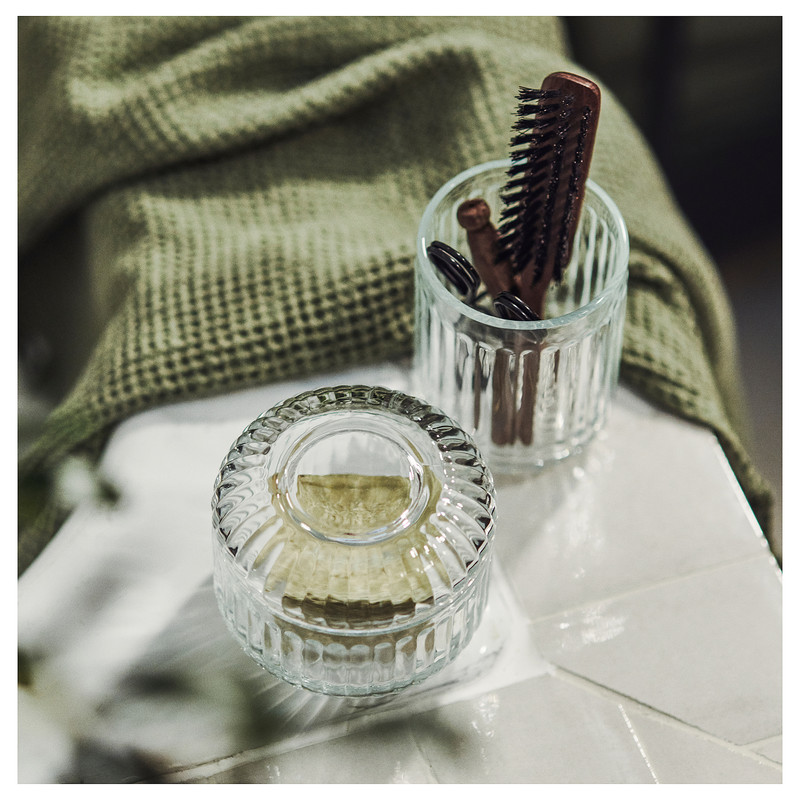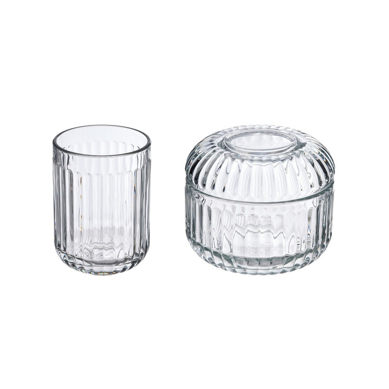 جامسواکی و ظرف دربدار پنبه و اکسسوری مدل SILVTJÄRN, از جنس شیشه شیاردار است. از لیوان بعنوان گلدان و از ظرف بعنوان نظم دهنده میز آرایش نیز میتوان استفاده نمود.