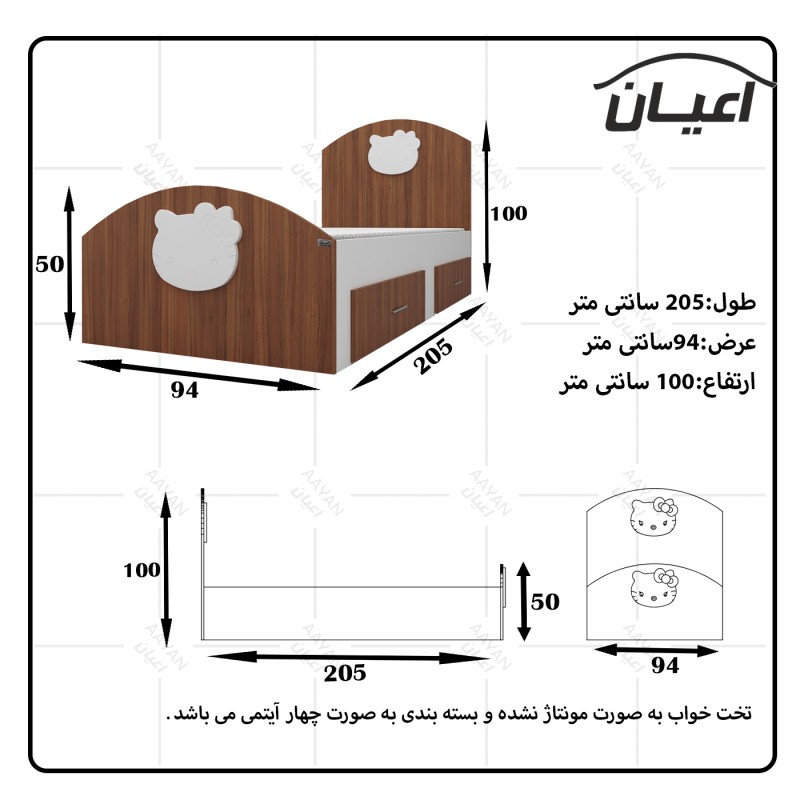 تخت خواب یک نفره طرح کیتی-جنس نئوپان ملامینه شرکتی-کلگی ها دارای طرح کیتی با جنس وکیوم می باشد-دارای دو کشو است - کالا فاقد تشک می باشد-سایز تشک مناسب 90x200سانت است-کالا به صورت مونتاژ نشده ارسال می شود - بسته بندی کالا به صورت چهار آیتمی است - جنس کفی تخت نئوپان خام به صورت دو تکه است-رنگ بندی کالا در آلبوم قابل مشاهده است-تنها در صورتی کالای انتخابی مطابق با تصاویر و مشخصات درج شده خواهد بود که هنگام انتخاب فروشنده، فروشنده رسمی برند که با تیک آبی مشخص شده است را انتخاب نمایید. هنگام خرید و دریافت کالا به بسته بندی و لوگوی برند دقت فرمایید.