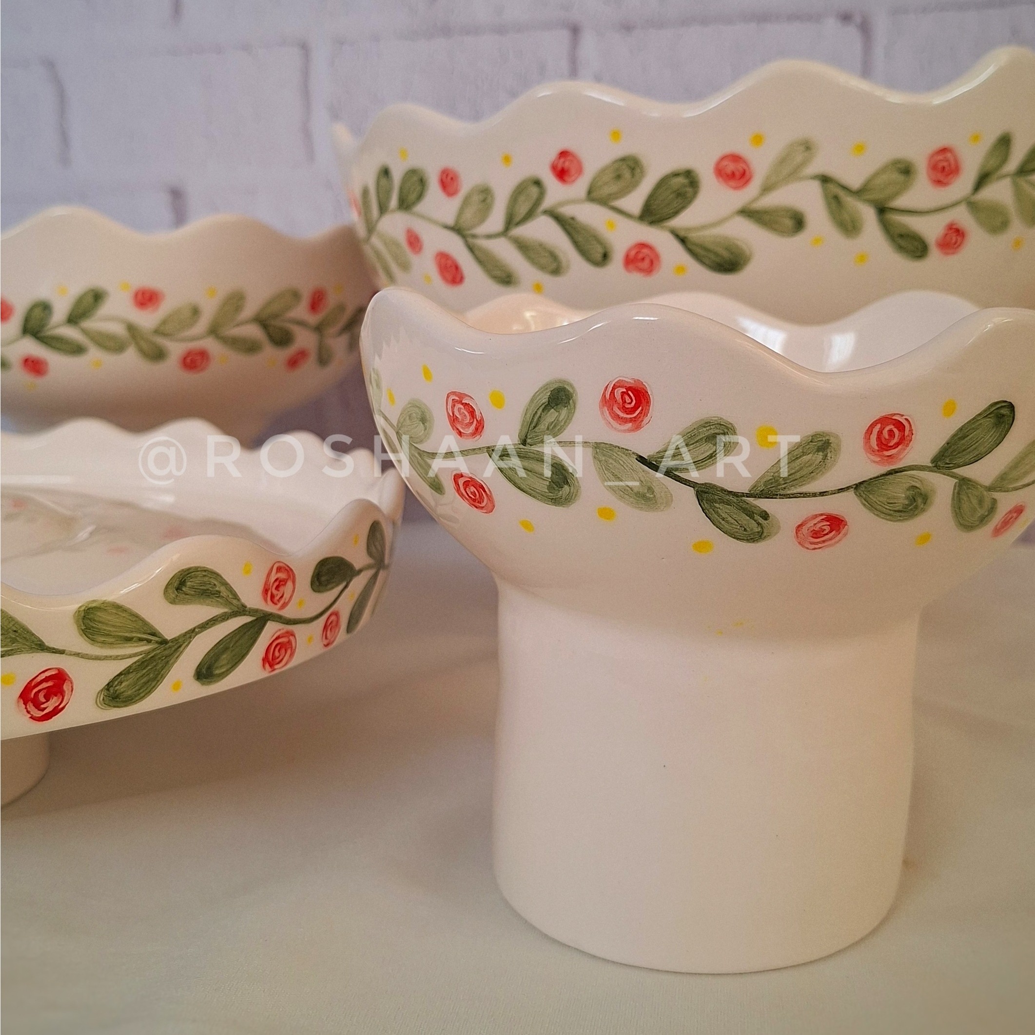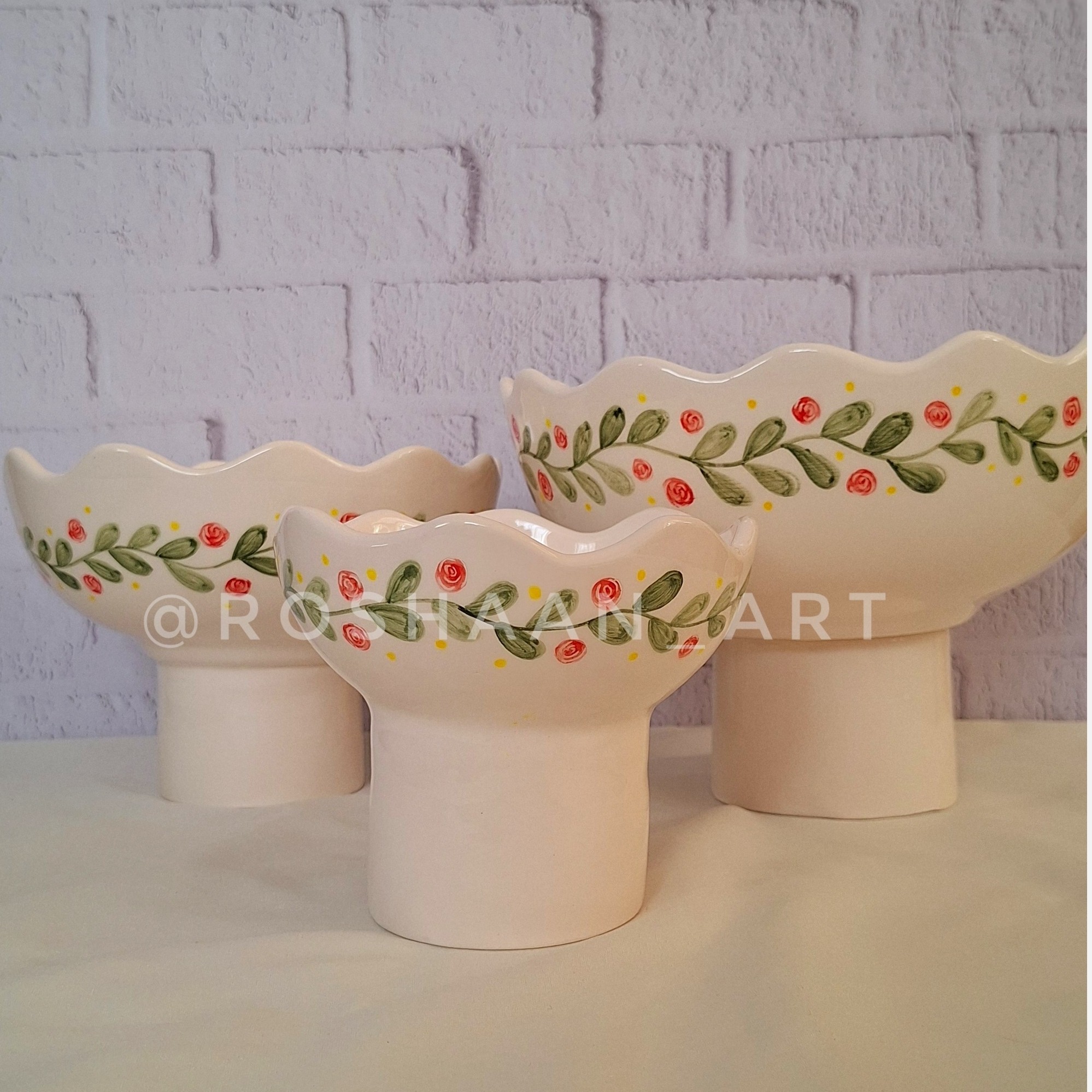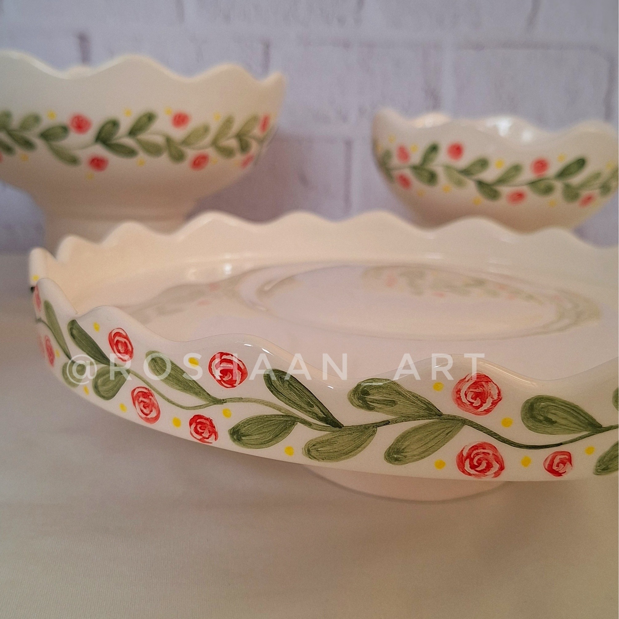 ظرف ها دستساز هستن 4 تیکه میوه خوری،آجیل خوری، شکلاتخوری و شيريني خوری قطر کارها به ترتیب،25 سانت،20 و 15 و 27 سانت میتونین بهش ظرف و قندون و یا آیتم های دیگه هم اضافه کنین یا به صورت تک سفارش بدید از بهترین متریال