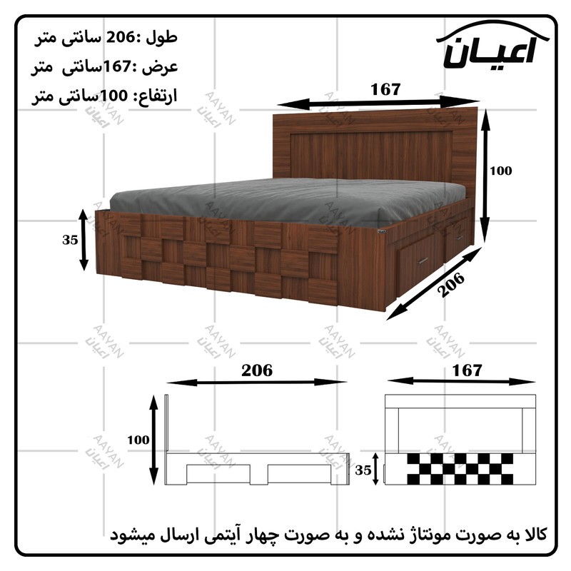 تخت خواب دو نفره .جنس نئوپان ملامینه شرکتی. کلگی دارای طراحی مدرن که به صورت قید دوبل می باشد. کالا فاقد تشک می باشد. سایز تشک مناسب 160x200سانت است کالا به صورت مونتاژ نشده ارسال می شود - دارای دو عدد کشوی چرخدار که قابل جابجایی است- بسته بندی کالا به صورت چهار آیتمی است - جنس کفی تخت نئوپان به صورت سه تکه است - رنگ بندی کالا در آلبوم قابل مشاهده است-تنها در صورتی کالای انتخابی مطابق با تصاویر و مشخصات درج شده خواهد بود که هنگام انتخاب، فروشنده رسمی برند که با تیک آبی مشخص شده است را انتخاب نمایید. هنگام خرید و دریافت کالا به بسته بندی و لوگوی برند دقت فرمایید.