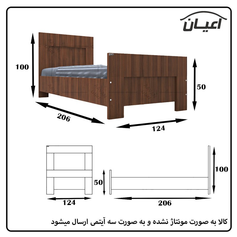 تخت خواب یک نفره -جنس نئوپان ملامینه شرکتی-کلگی بالا دارای قید به صورت دوبل است -کالا فاقد تشک می باشد-سایز تشک مناسب 120x200سانت است-کالا به صورت مونتاژ نشده ارسال می شود - بسته بندی کالا به صورت سه آیتمی است - جنس کفی تخت نئوپان به صورت دو تکه است-رنگ بندی کالا در آلبوم قابل مشاهده است-تنها در صورتی کالای انتخابی مطابق با تصاویر و مشخصات درج شده خواهد بود که هنگام انتخاب، فروشنده رسمی برند که با تیک آبی مشخص شده است را انتخاب نمایید. هنگام خرید و دریافت کالا به بسته بندی و لوگوی برند دقت فرمایید.