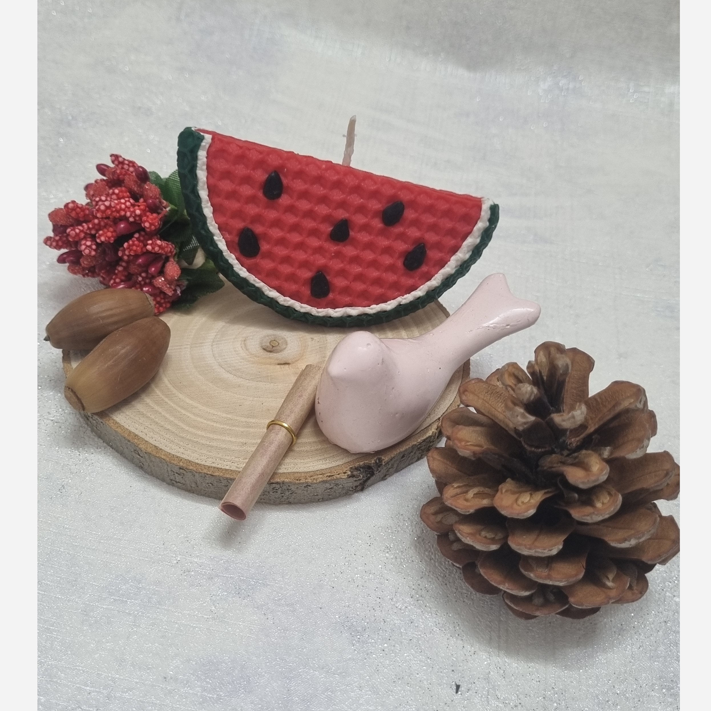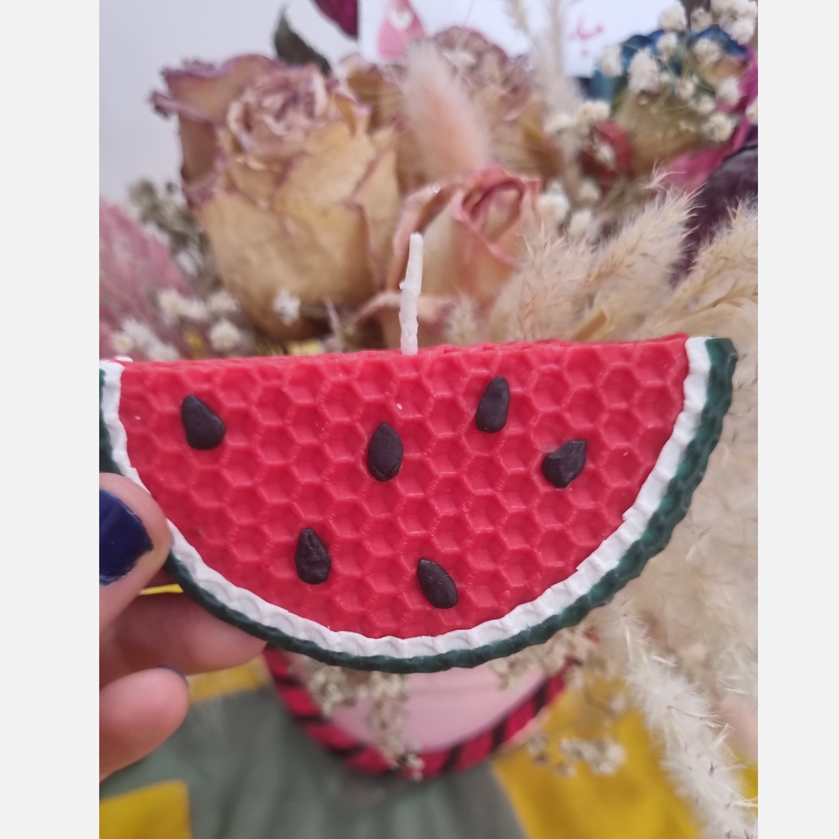🕯شمع موم عسل 🕯شمع هندوانه ای شب یلدا🍉🍉 🕯شمع طبیعی کار دست 🕯باطرح ورنگ دلخواه شما ساخته میشود