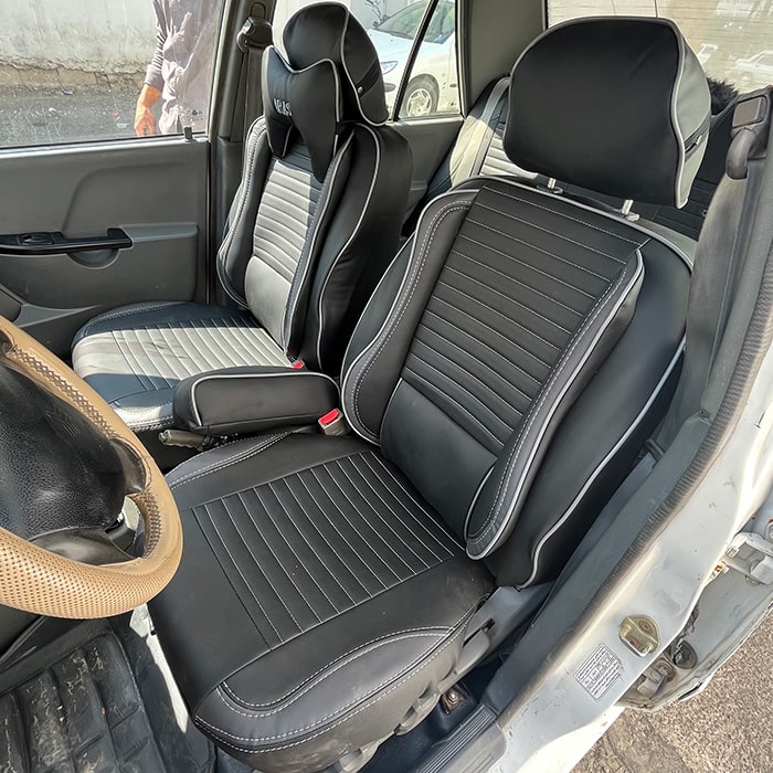 روکش صندلی پراید 131 چرم طرح پلاس رنگ مشکی طوسی مبلمونسرا مدل 237916