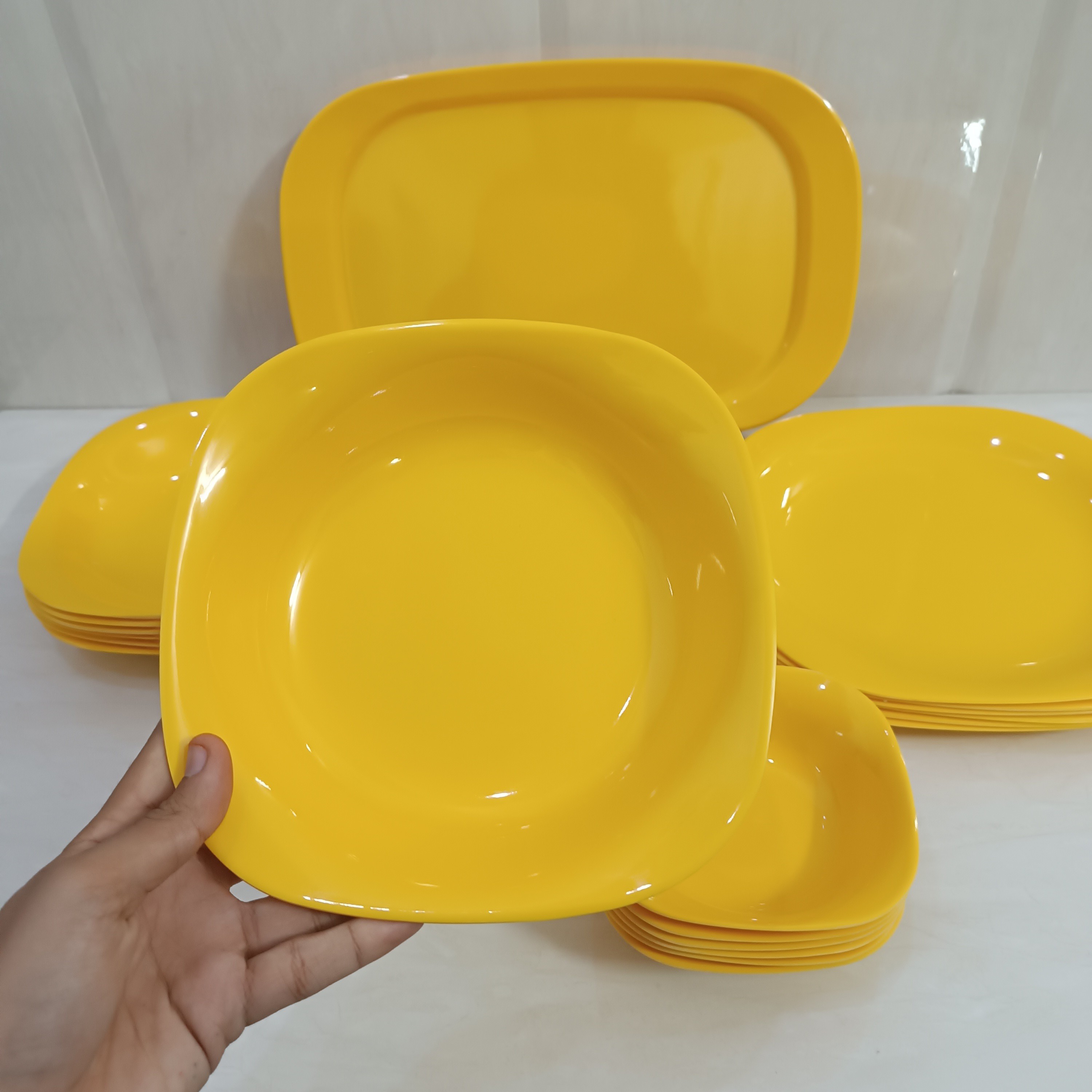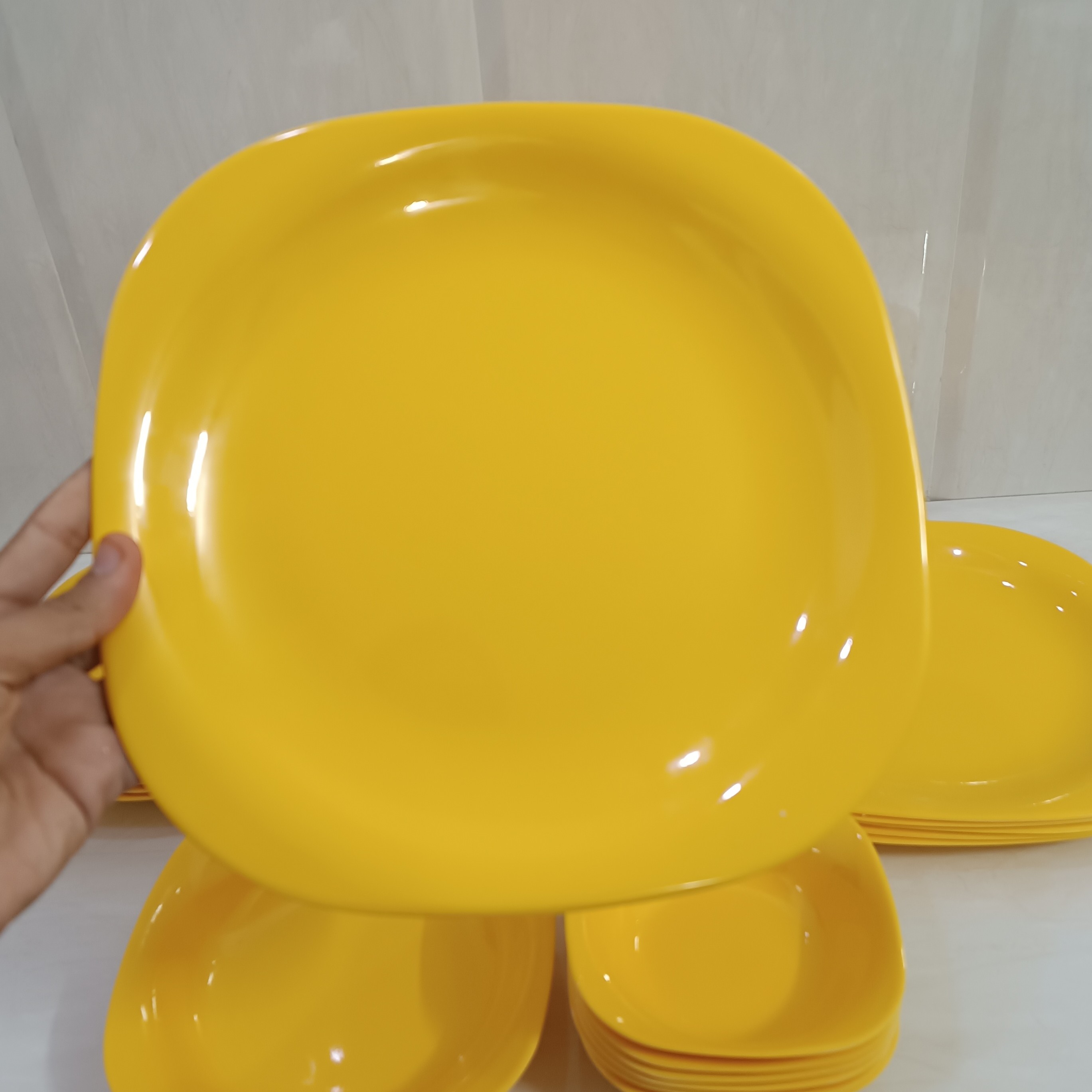 سرویس غذاخوری ملامین رنگی مربع زرد مارک شیرکوه یزد دارای استاندارد مواد درجه یک سرویس 26 پارچه مربع شامل: 6عدد بشقاب برنج خوری سایز 25.5 6 عدد بشقاب خورشت خوری سایز 21 6 عدد بشقاب میوه خوری سایز 20 6عدد کاسه ماست خوری بزرگ سایز 13.5 1 عدد کاسه سالاد سایز 19.5 در 4 یک عدد دیس بزرگ برنج 37 در 24 تولید کارخانه یزد دارای استاندارد ملامین اصل مواد درجه یک