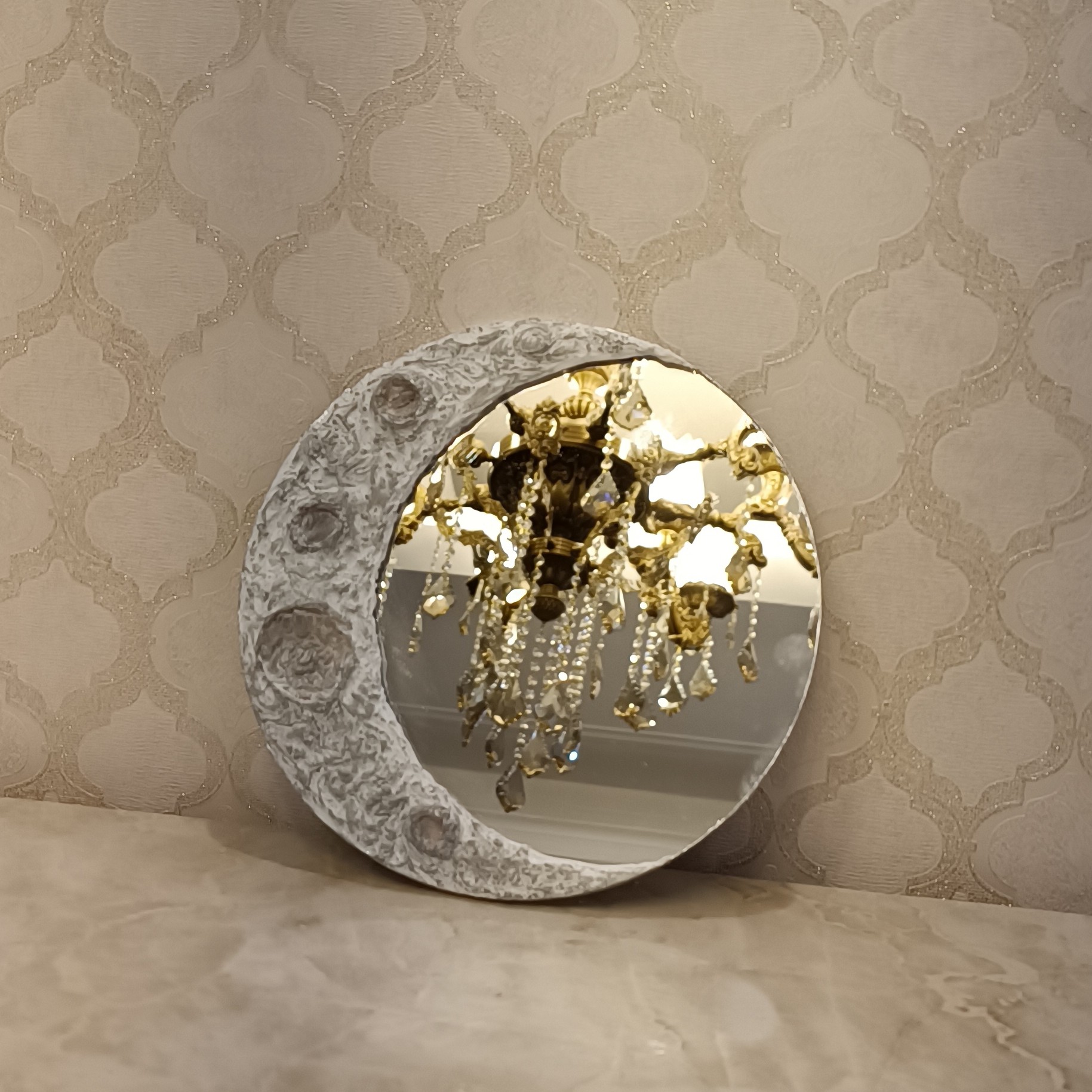 اینه طرح ماه تابان . ترکیب اینه و طرح ماه ورنگ شبتاب که در تاریکی میدرخشه و نور از خودش پخش میکنه . در رنگ و ابعاد دلخواه قابل اجراست