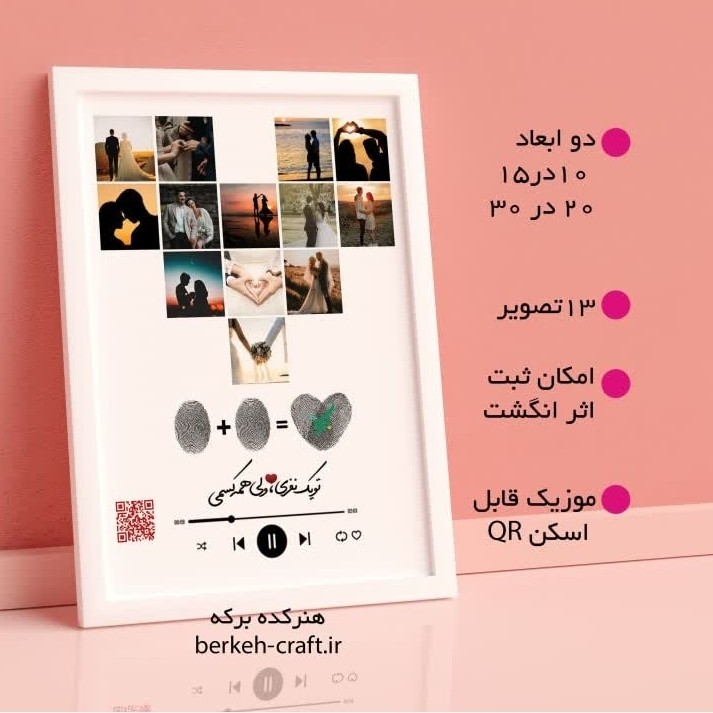 توجه کنید طرح های تابلو موزیکال هنرکده برکه بسیار متنوع می باشد برای دیدن سایر طرح ها در چت باسلام پیام بگذارید. یا در غرفه ما کلمه <تابلو موزیکال> را سرچ کنید. ثبت سفارش تابلوهای اختصاصی «هنرکده برکه» لطفاً پس از ثبت سفارش، جهت تکمیل اطلاعات و ارسال فایلها از طریق یکی از پیامرسانهای زیر اقدام فرمایید: 📞 شماره تماس و پیامرسانها: 09165690687 --- فایلهای مورد نیاز برای ساخت تابلو: 🎵 فایل صوتی یا موسیقی یا کلیپ ویدیویی با حجم کمتر از 10 مگابایت 📝 متن دلخواه شما --- امکانات ویژه رایگان: 🗓 افزودن تقویم با تاریخ خاص 👫 درج نام زوجین --- ارسال و بستهبندی: ✉️ ارسال با پست پیشتاز بستهبندی چندلایه و محافظتی اجرای تابلو بهصورت بکلایت نیز ممکن است. ویژگیهای تابلوهای بکلایت: ✨ نورپردازی از پشت قاب، دقیقاً مطابق تصویر درجشده در سایت 🔋 دارای جعبه باتری و دکمه خاموش/روشن در پشت قاب ✅ تست کامل تابلو پیش از ارسال ❗ باتری قلمی به عهده خریدار محترم است