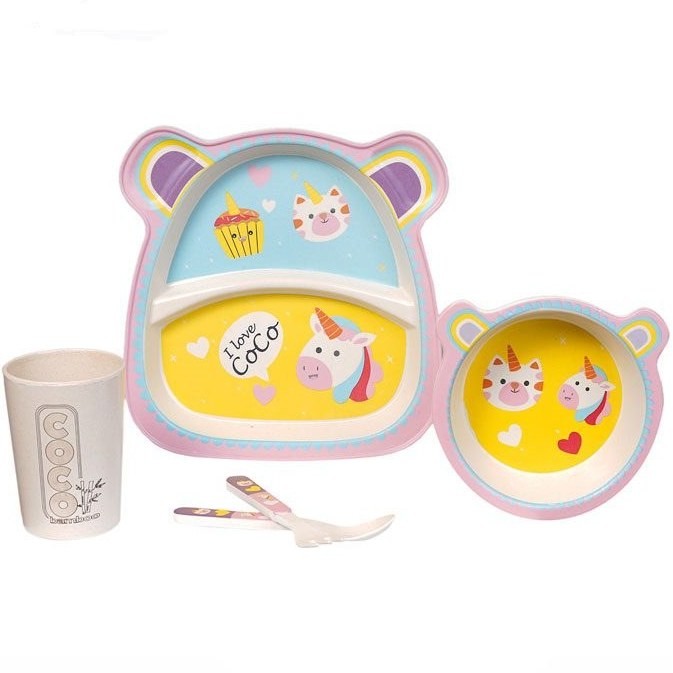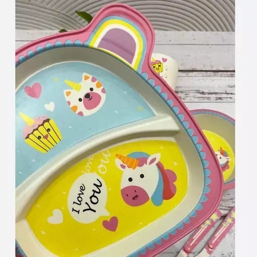 سرویس غذا خوری کودک طرح گربه شاخ دار بامبو شامل یک عدد بشقاب دو قسمته یک عدد لیوان یک عدد کاسه سوپ خوری یک عدد چنگال یک عدد قاشق قبل از سفارش موجودی حتما چک کنید