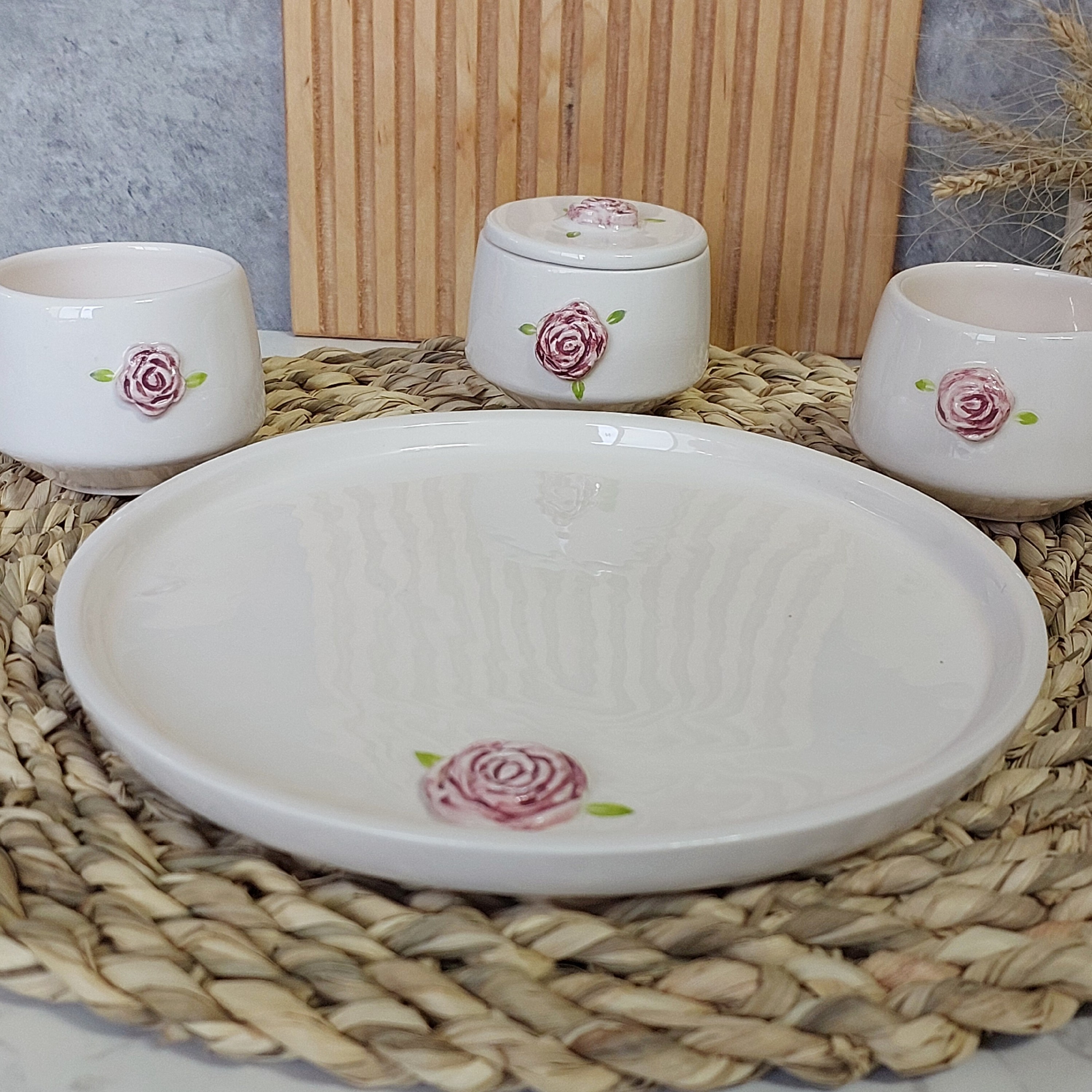 ست چایخوری سرامیکی گلبرجسته طرح رز صورتی شامل 2عدد فنجان و 1عدد قندان و یک سینی سایز 23 میباشد گلها کاملا با دست ساخته و نقاشی شدند این ظروف زیبا را میتونید به راحتی در ماکروویو و ماشین ظرفشویی قرار بدید امکان ثبت سفارش با طرح و رنگ دلخواه استفاده از بهترین مواد اولیه و لعاب بدون سرب تضمین ارسال سالم محصولات
