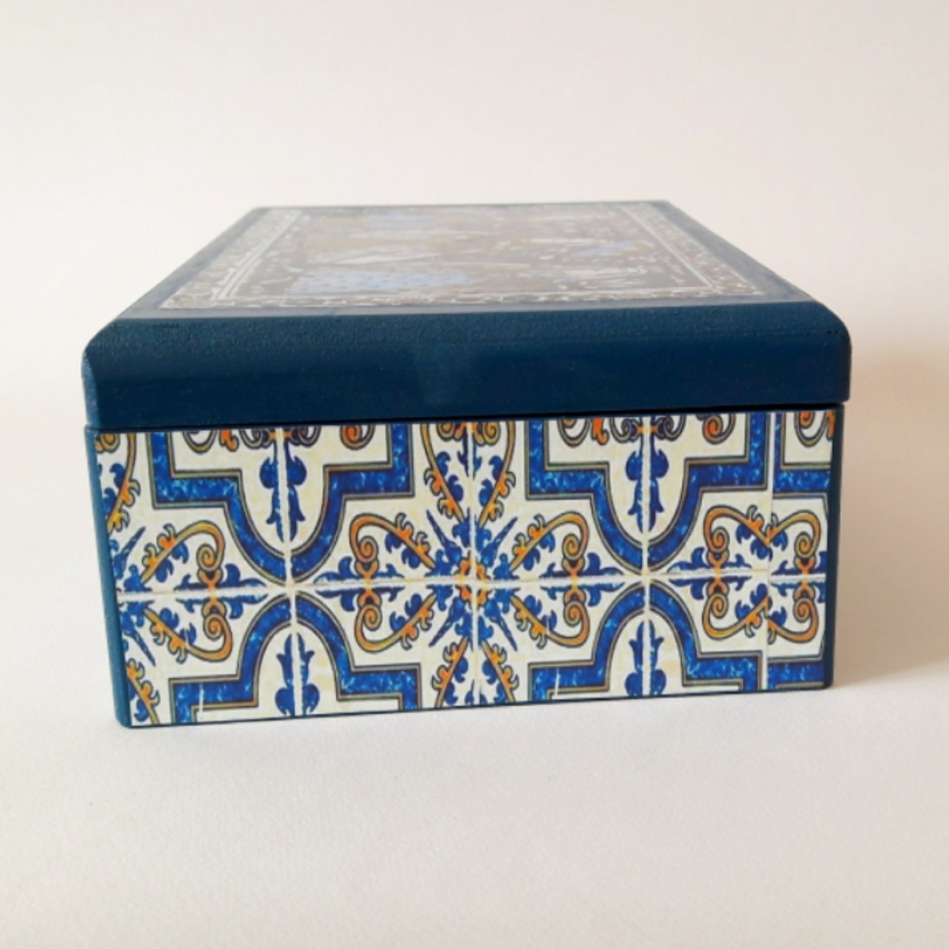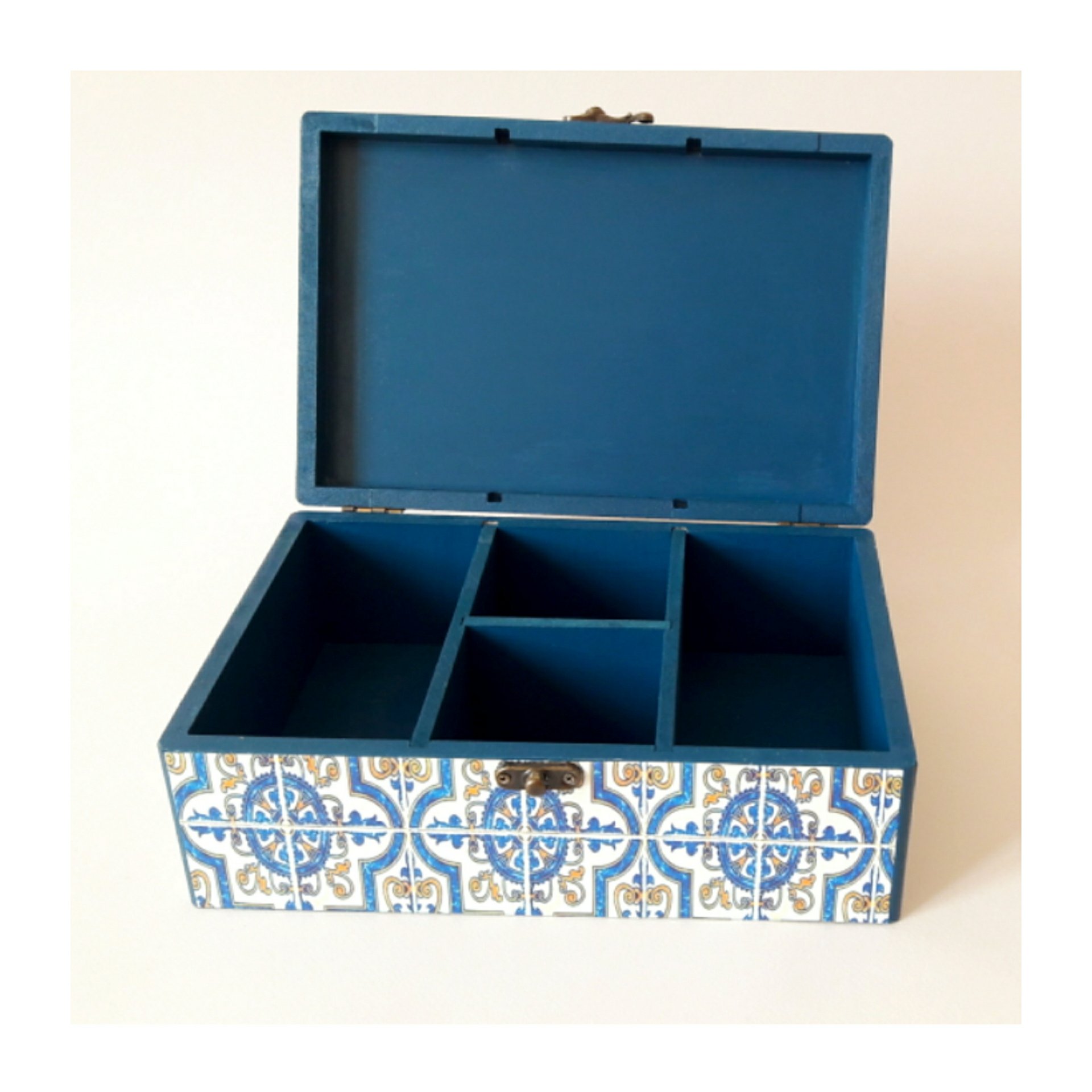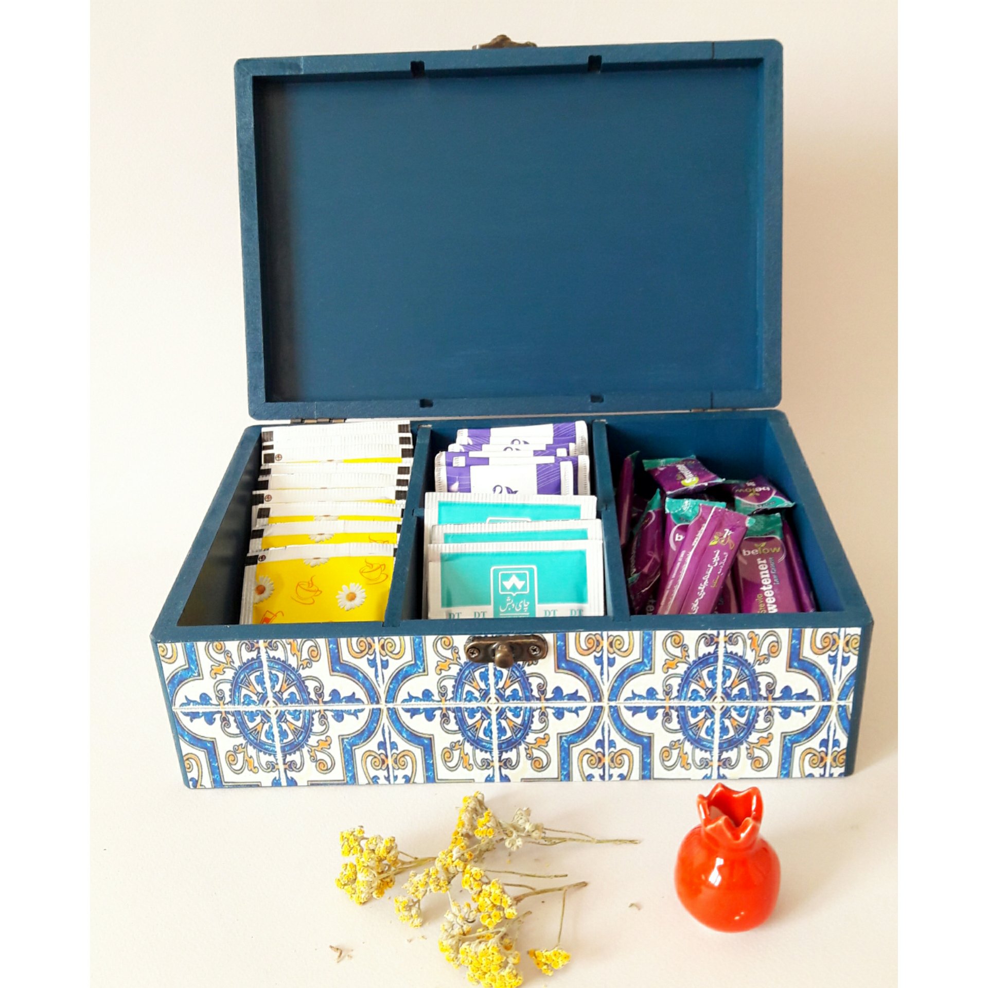 جعبه تیبگ یا باکس مخصوص چای نپتون و نسکافه محصول دستساز است جهت نظم دهی میز پذیرایی و جلوه دادن و زیبایی روی میز منزل یا محل کار. این جعبه فانتزی دارای تقسیمات متعدد و مناسب برای دمنوشها، قهوههای فوری، گل و تزئینات نوشیدنیهاست. همچنین مناسب آجیل، خشکبار، نبات و تنقلات میباشد. این جعبه چوبی هنری مانند سایر کارهای چوبی گالری بارون، قابل شستشوست و با مواد ضدآب کاور شده است. جعبه چوبی تیبگ دارای ابعاد و ارتفاع است. و از ام دی اف ساخته شده و دارای دولولا و یک چفت فلزی است. رنگ این جعبه کادویی، تماما به رنگ سرمهای است و روی درب جعبه و بدنه خارجی طرح سنتی طراحی شده و با تکنیک دکوپاژ تزئین شده است. داخل جعبه دکوراتیو، پارتیشن بندی شده و قابل جداسازی از جعبه است و دیوارههای متحرکی دارد. این جعبه مناسب تمام سنین و همچنین جهیزیه ست. جعبه پذیرایی لوکس را میتوان به عنوان هدیه به دوستان با سلیقه خود تقدیم کنید. با این جعبه مدرن، حق انتخاب انواع دمنوشها را به میهمانان خود بدهید.