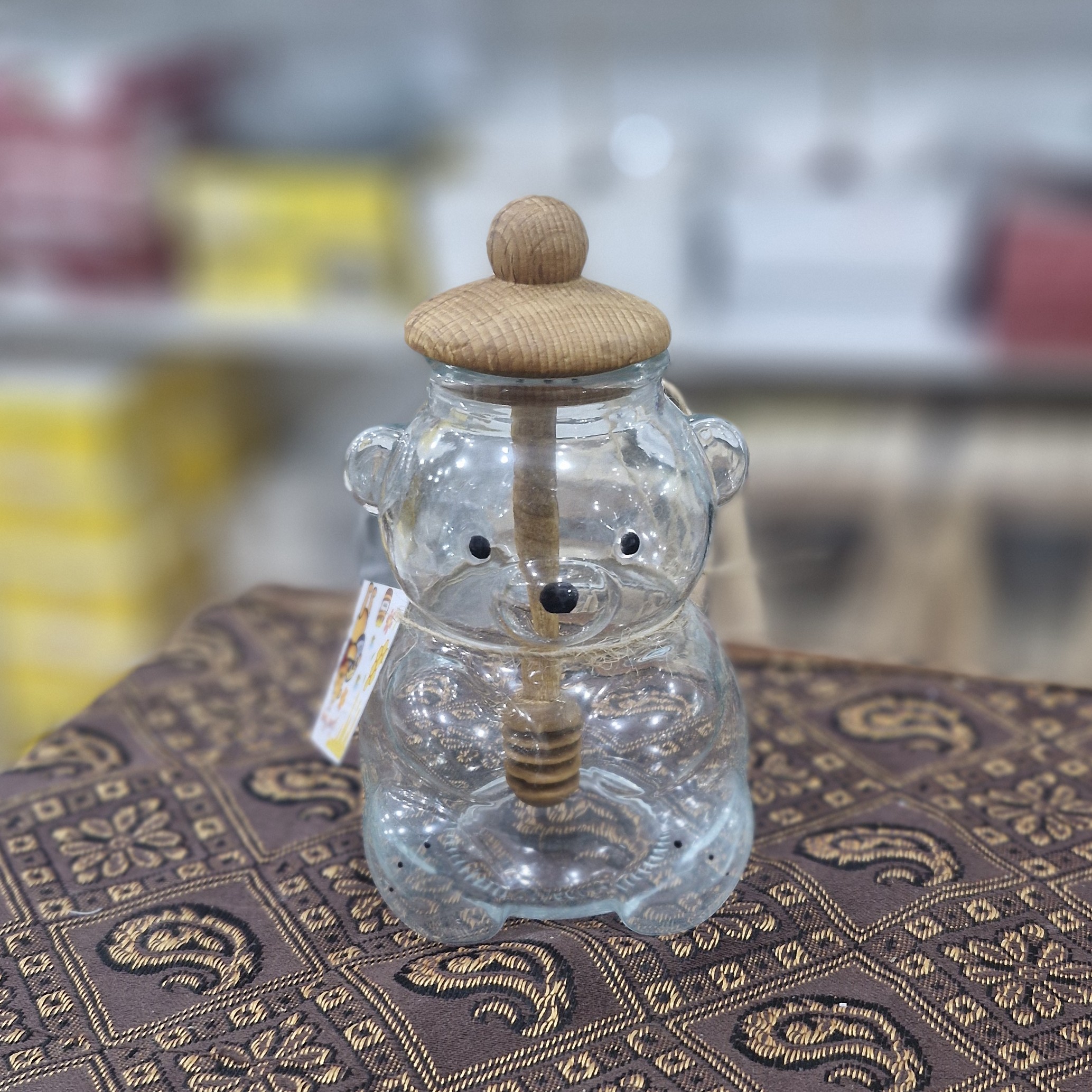 عسل خوری خرسی شیشه شفاف درب چوبی دارای قاشق چوبی عسل