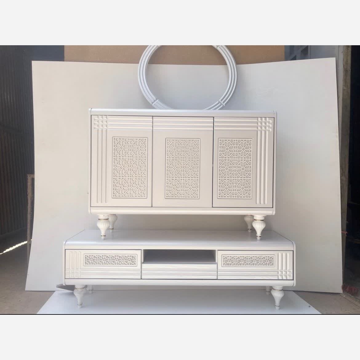 ست کارولین شامل میز تی وی طول 160 کنسول اینه طول 150 جاکفشی طول90 تمام ام دی اف داخل کار ملامینه درهامگنتی رول وکیوم frp .کشوها 8 سانتی.ریل 3 تیکه با بهترین کیفیت داری رنگبندی بلوط کلیاف روشن گردویی سفید صدفی ابروباد