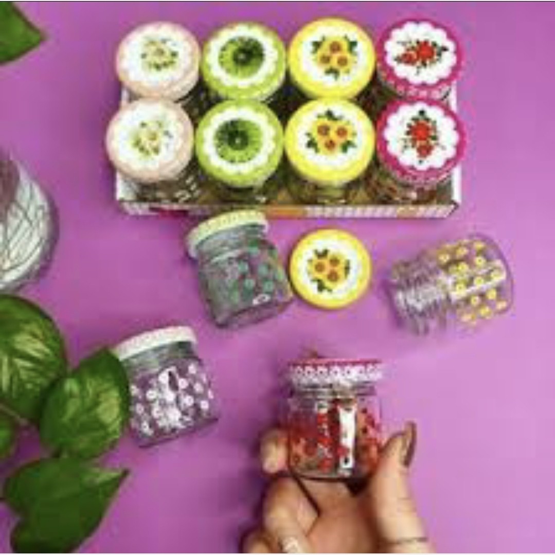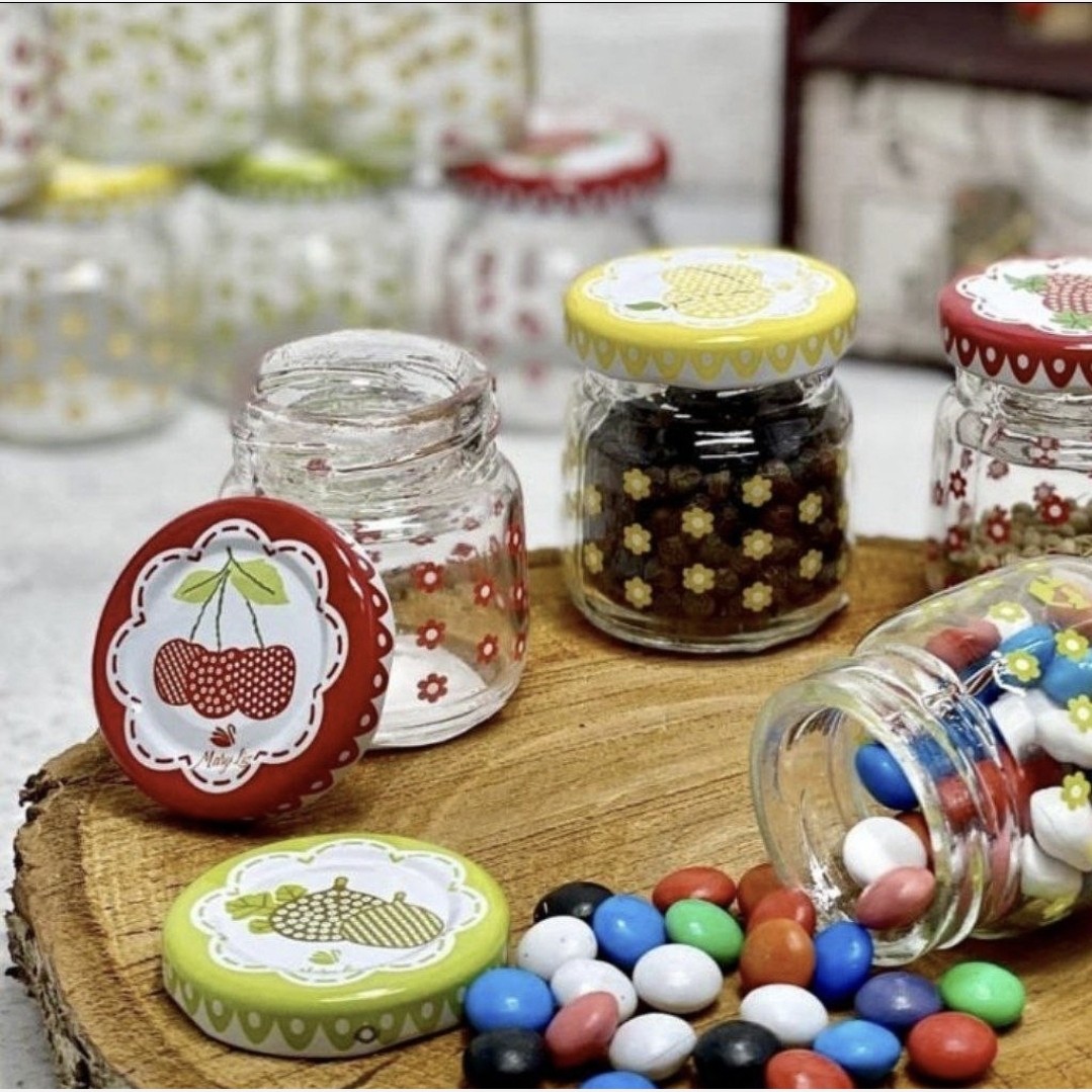 بانکه نقلی شیشه ای طرح دار یه بانکه شیک و گوگولی مناسب زعفران، هل،وانیل همراه با درب فلزی طرح دار یه کار شیک و خاص و جذاب مخصوص کدبانوهای خاص ابعاد 5 در 4.5