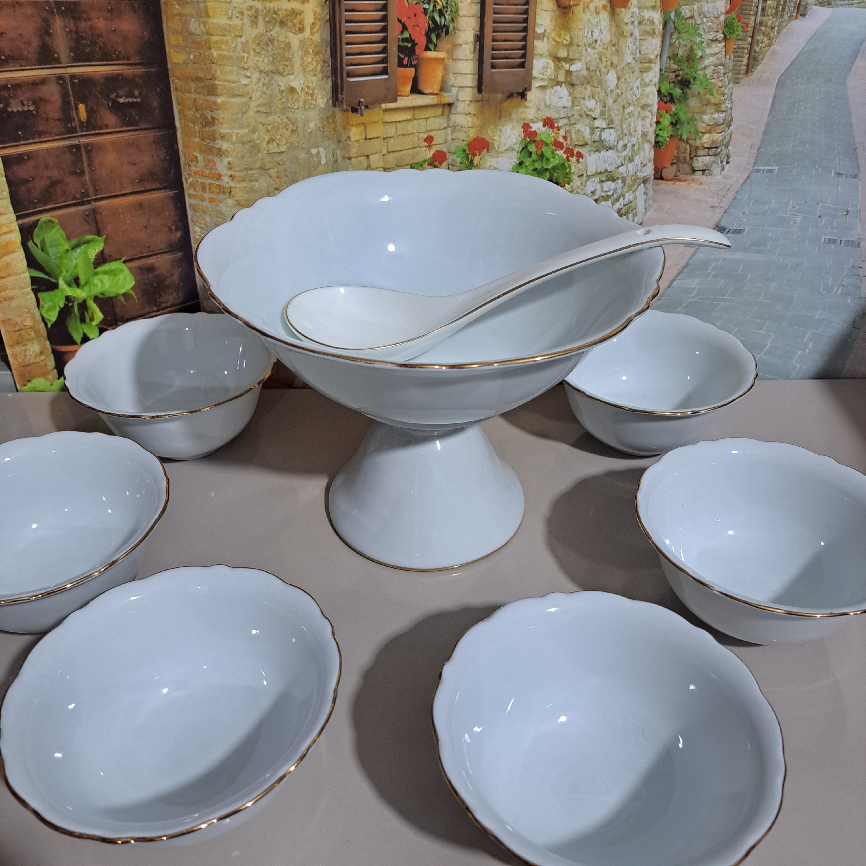 ست 7 پارچه چینی سفید لب طلایی یک کاسه پایه دار 6 عدد پیاله مناسب آجیل تنقلات انار .... ارسال