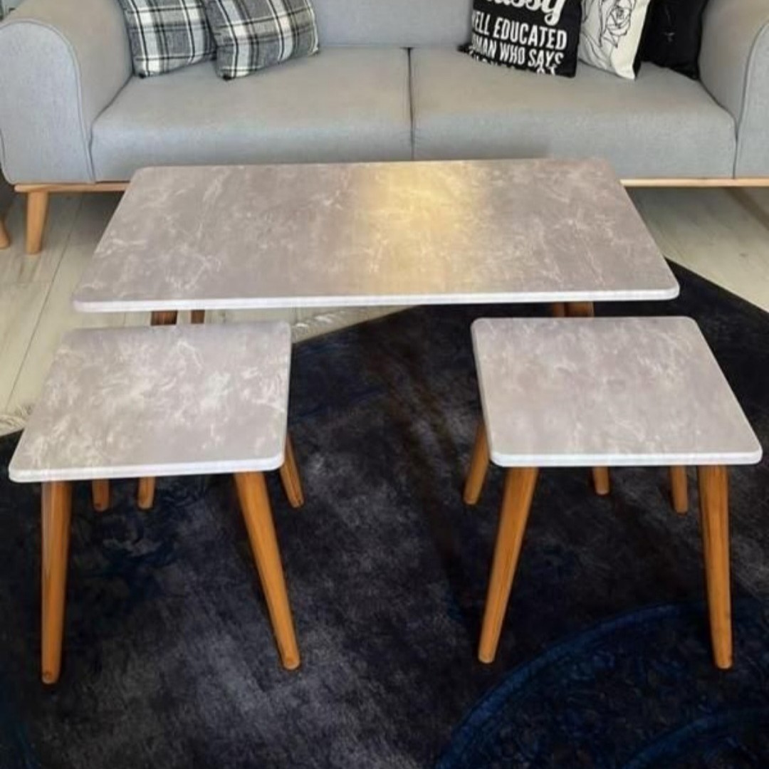 یک میز با سه عدد عسلی صفحه وکیوم ضد خش پایه ها بازشو ارسال بصورت بسته بندی با کارتن یا مشمای حبابدار دارای رنگ بندی