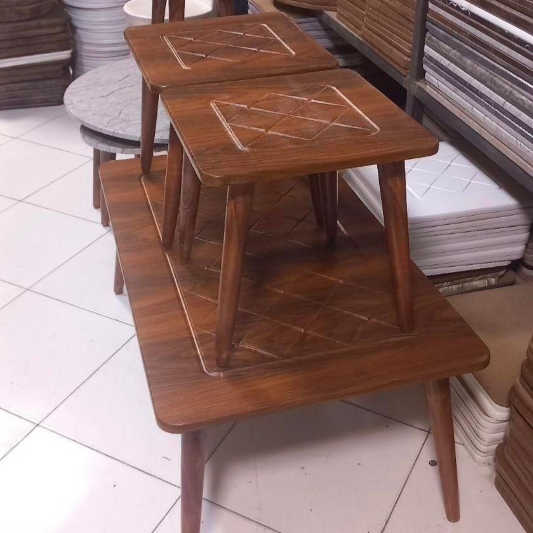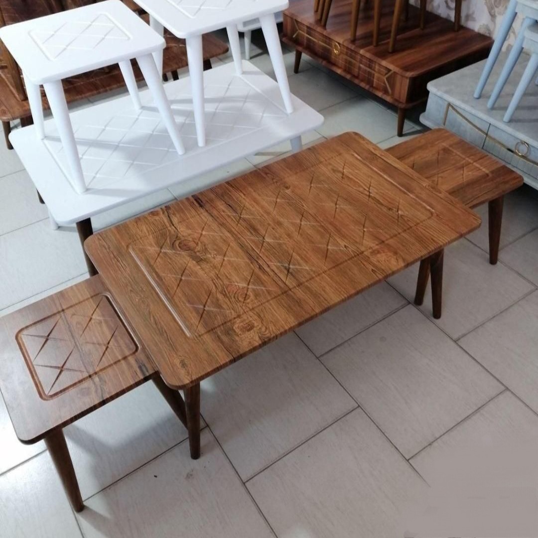یک میز با سه عدد عسلی صفحه وکیوم ضد خش پایه ها بازشو ارسال بصورت بسته بندی با کارتن یا مشمای حبابدار دارای رنگ بندی