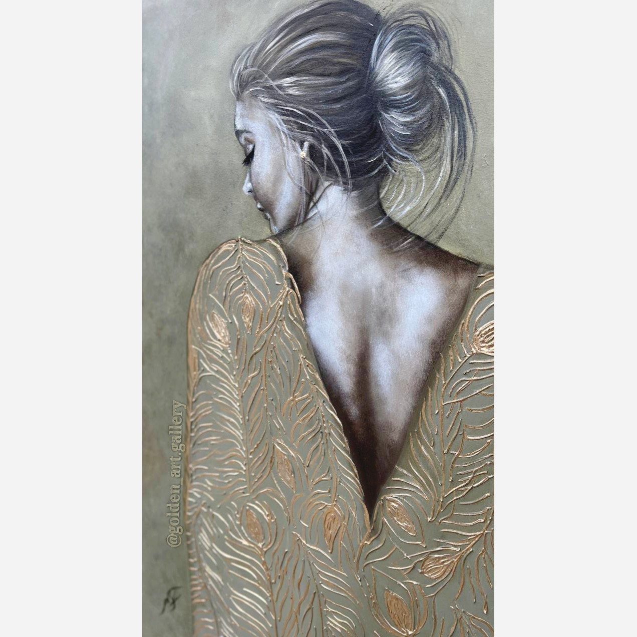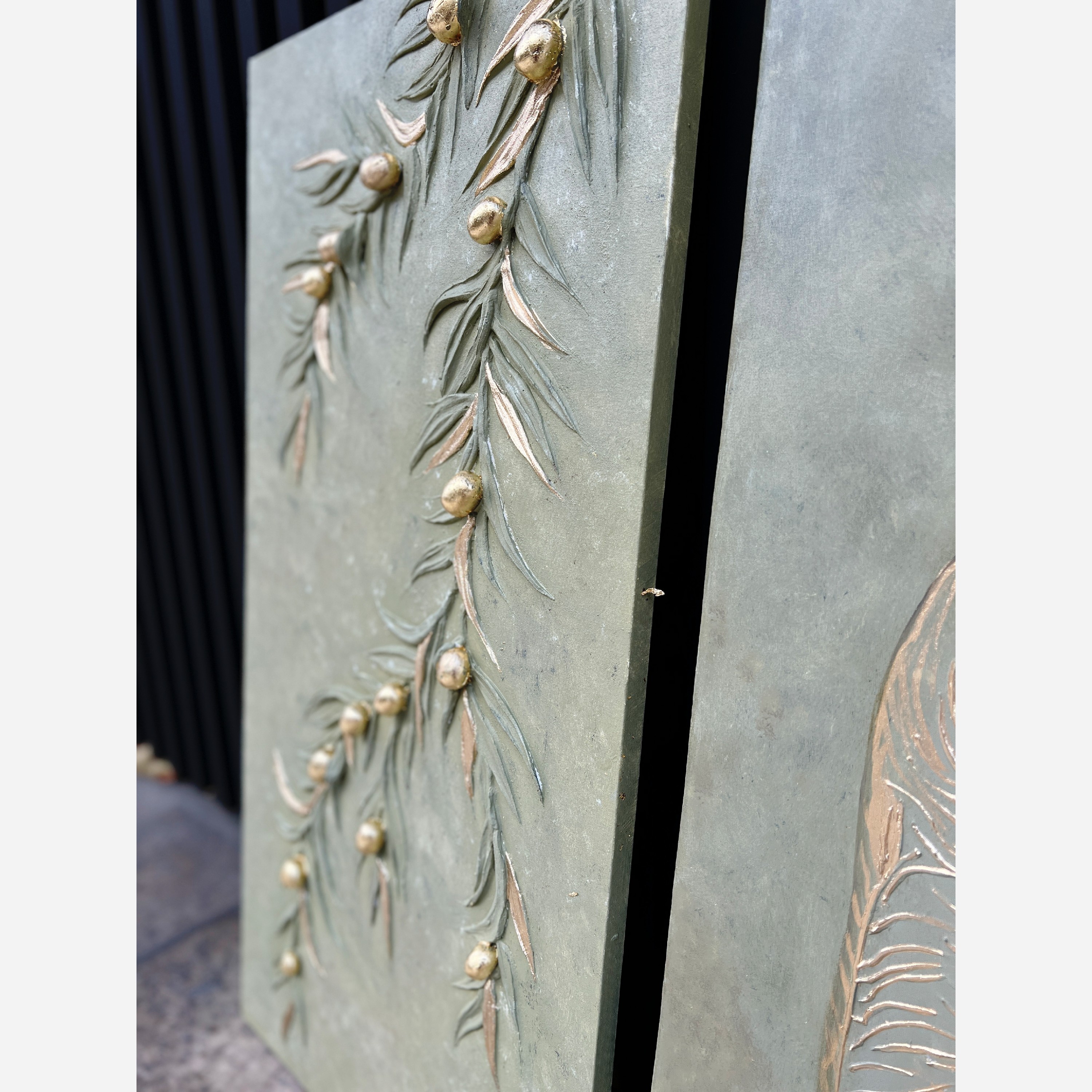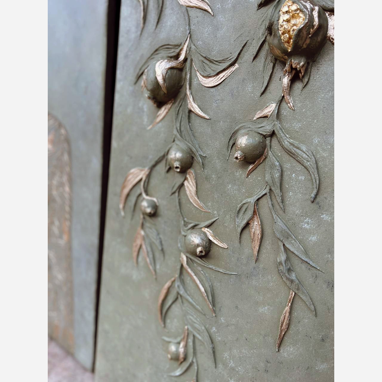 تابلو نقاشی برجسته سه تکه اجرا شده روی بوم نقاشی درجه یک کانواس با زوار چوب روس ابعاد تابلو وسط 80×60 و دوتای کناری 80×40 لباس زن برجسته کار شده و شاخه های انار و زیتون برجسته شده با رنگ روغن نقاشی شده با ورق طلا درجه یک کار شده