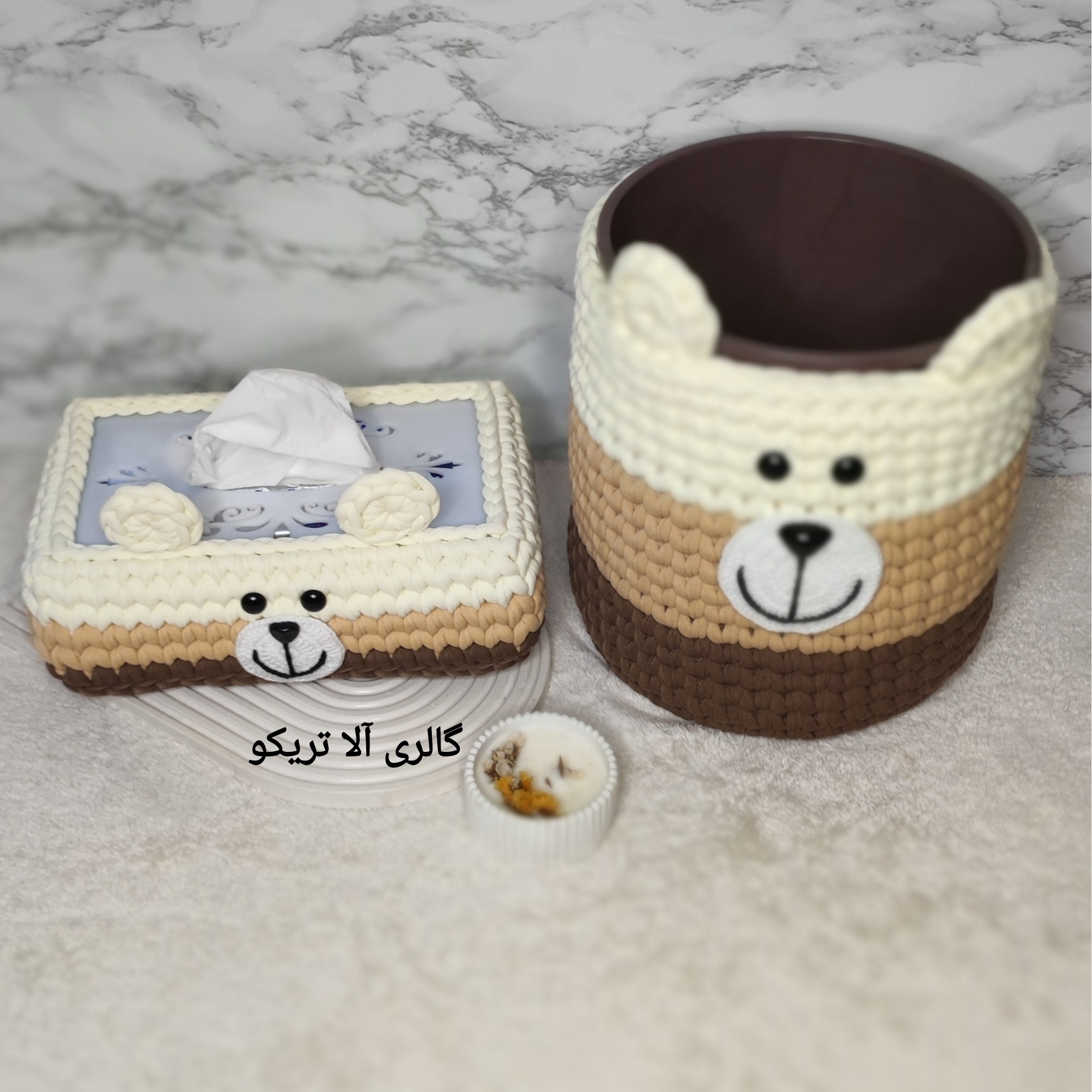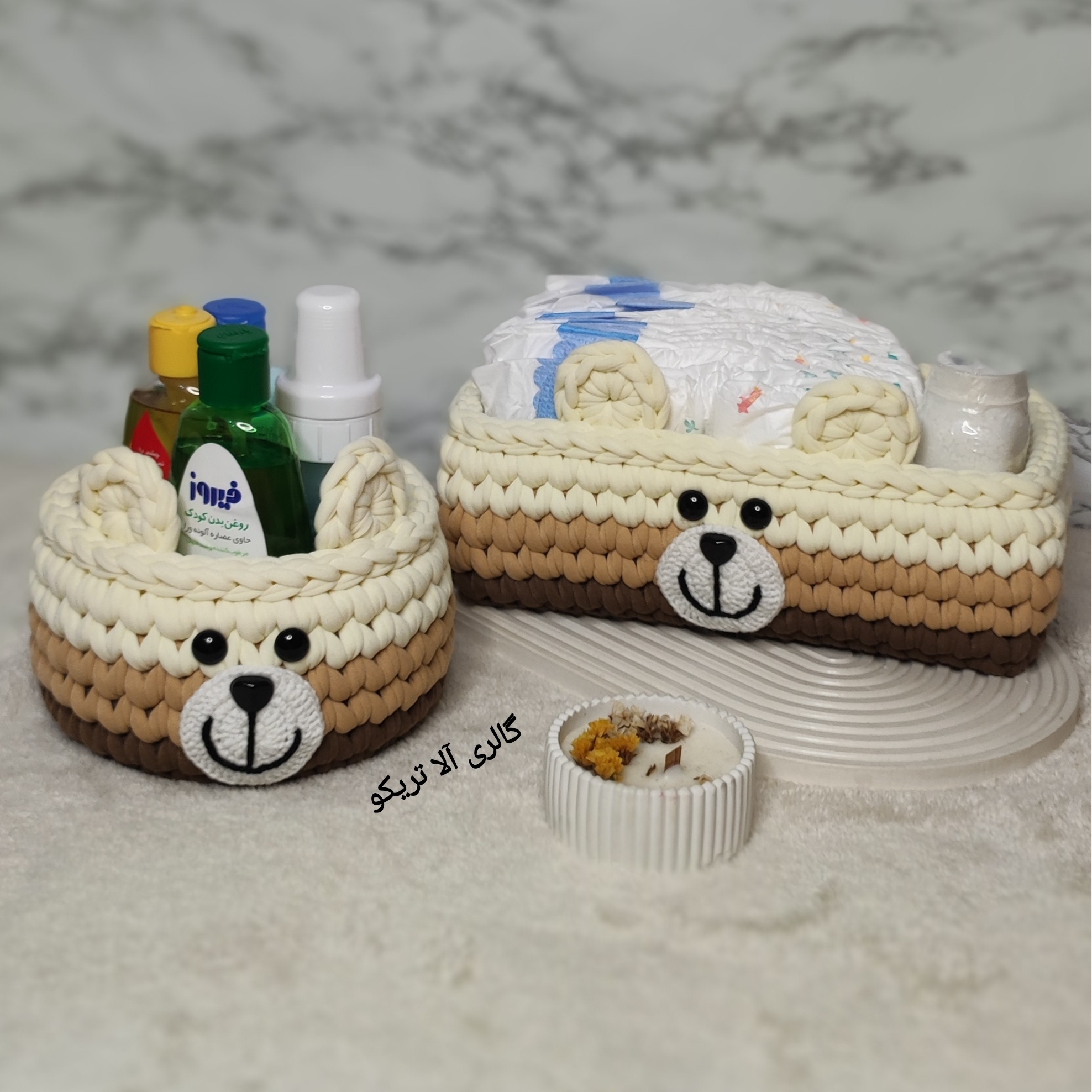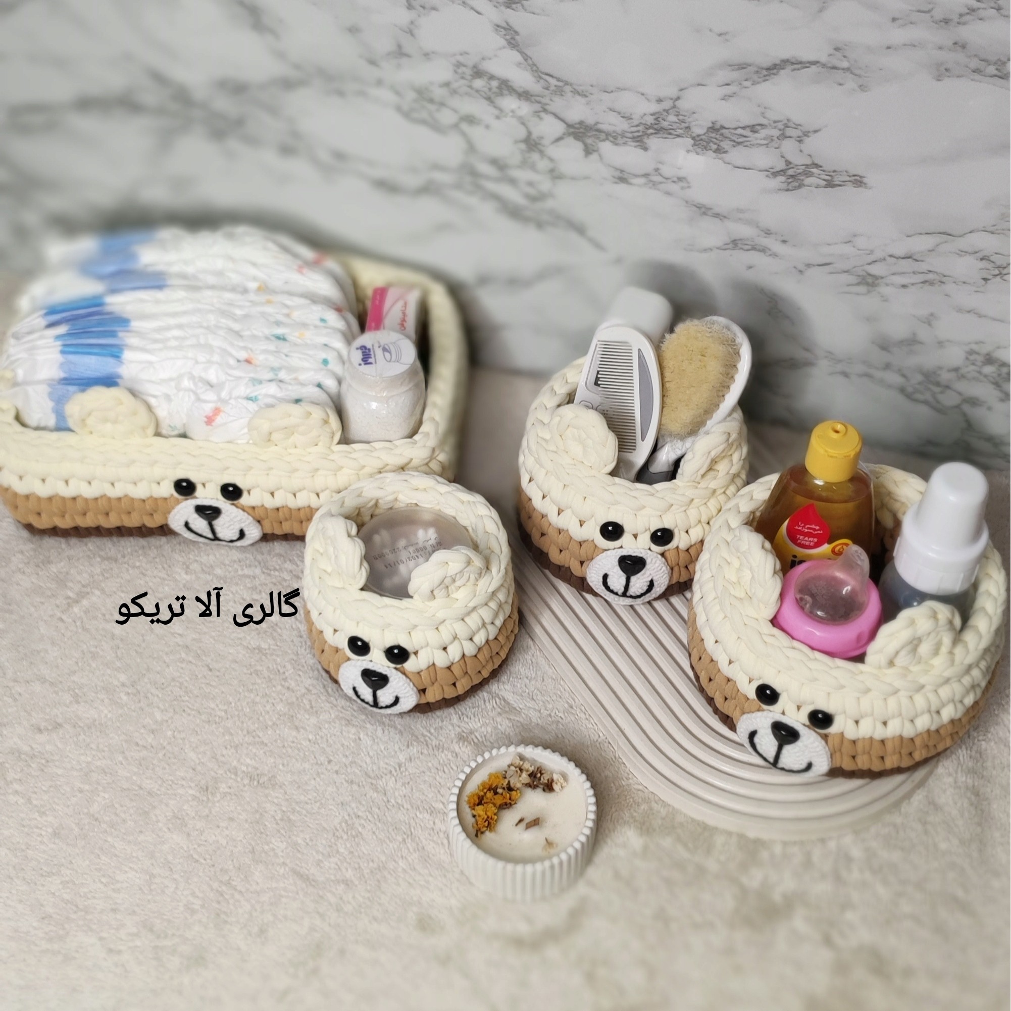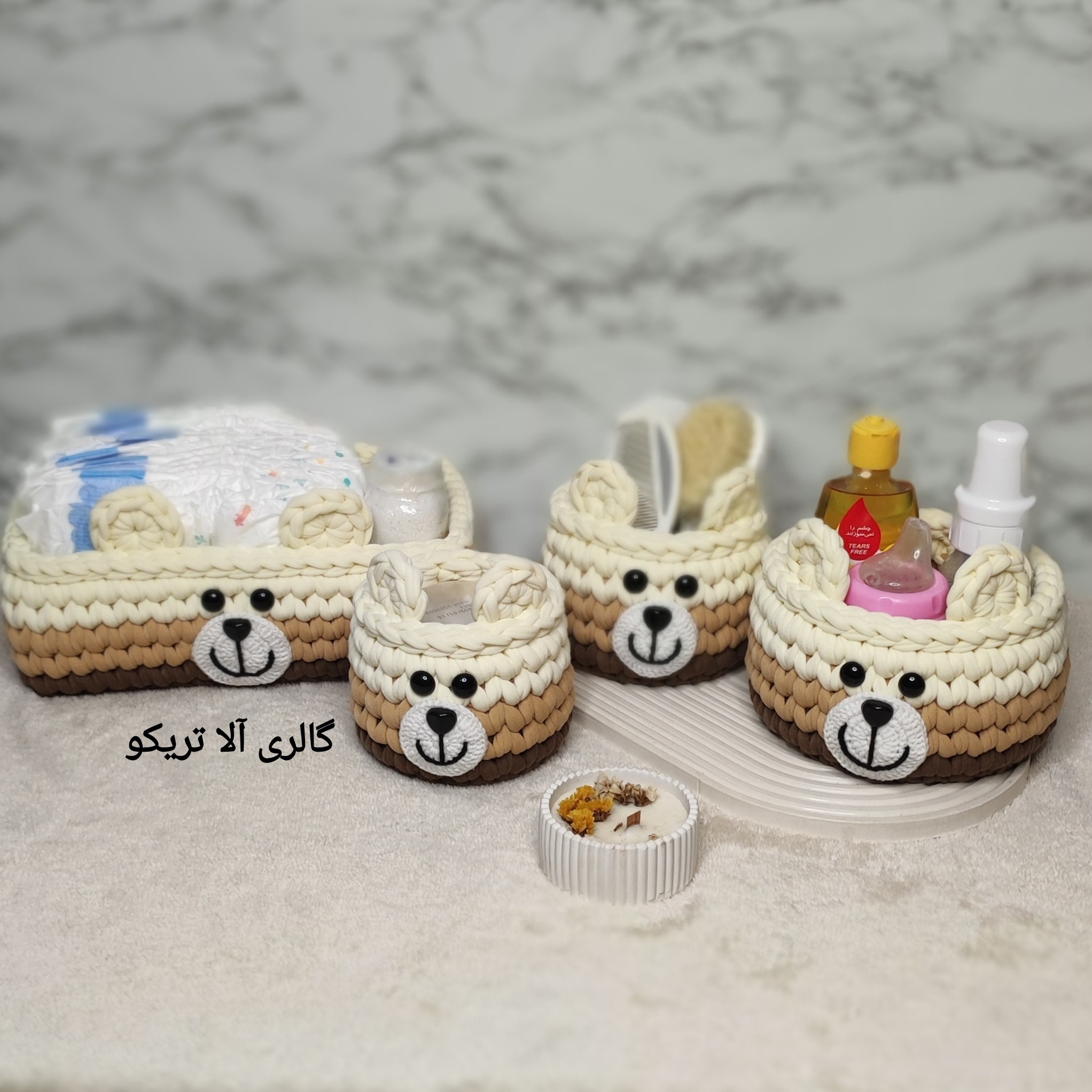 ست زیبای خرس تدی سبد های تریکو کاربردی برای مامان های که به زودی دلبندشون به دنیا میاد.😍 🔹 سبد نظم دهنده که میشه وسایل پرمصرف روزانه نوزاد خوشگلت رو توش بچینی. 🥰 ✅کاربرد: 1️⃣سایز 8 : گوش پاک کن 2️⃣سایز 12: جای برس، شونه، تبسنج،ناخنگیر 3️⃣سایز15: لوسیون،شامپو، شیشه شیر و ... 4️⃣سایز مستطیل 25 در 15 : جای پوشک و مای بیبی 5️⃣جادستمالی :مستطیل 25 در 15 6️⃣سطل: سایز20 و ارتفاع 24 🔹قابل شست و شو هم هست رنگش عوض نمیشه. پرز نمیده و ماندگاری بالایی داره.👌 🔴کفی پلکسی ضد آب نشکن مقاوم به رنگ سفید هست 🔴کفی چوبی از جنس ام دی آف به رنگ کرمی هست رنگ سبدتُ خودت انتخاب کن تا برات ببافم.