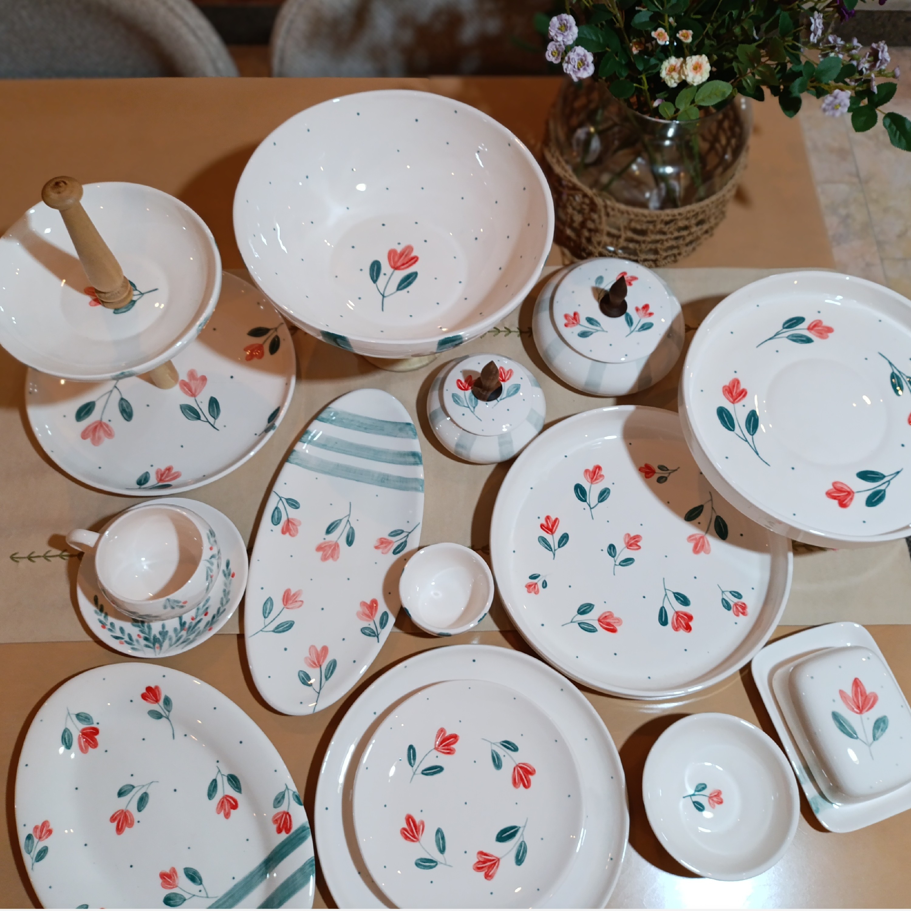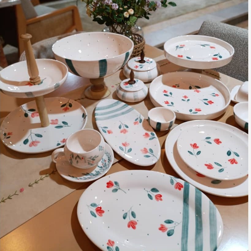 6عدد فنجان 6 عدد نعلبکی 6عدد بشقاب 27سانت 6عدد پیش دستی 6 عدد کاسه 8 سانت 6 عدد کاسه 13 سانت 1عدد دیس بیضی برنج 1عدد شیرینی خوری پایه دار چوبی 1 عدد کاسه میوه خوری پایه دار 1عدد شیرینی خوری دو طبقه دستگیره چوبی 1 عدد شکلات خوری 1عدد قندان 1عدد دیس بیضی رولت خوری 1عدد کره خوری 1 عدد دیس 27 سانت با کاسه بزرگ (قاب و قدح)