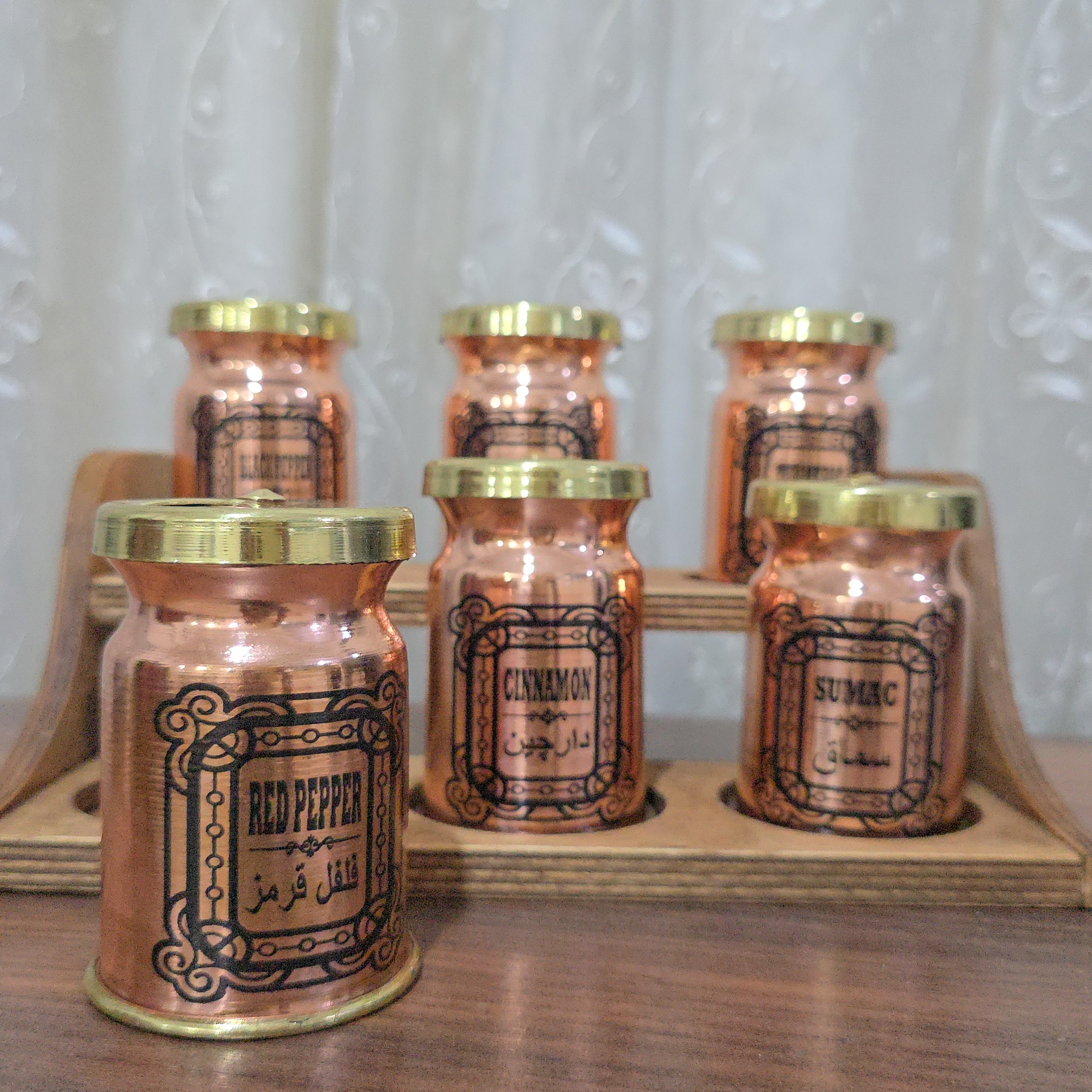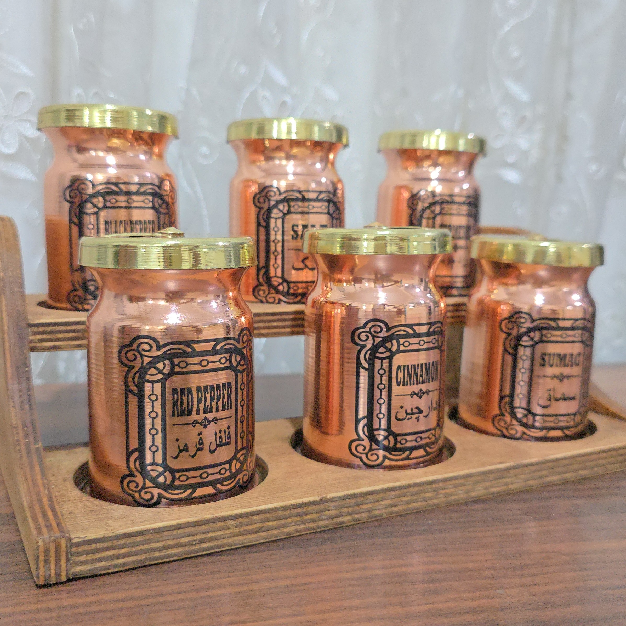 جا ادویه مسی نانو شده دارای شش عدد جای ادویه مسی یک استند فشرده ی چوبی سایز استند 10 در 16 در 26 سایز جا ادویه قطر 5/5 و ارتفاع 9/5
