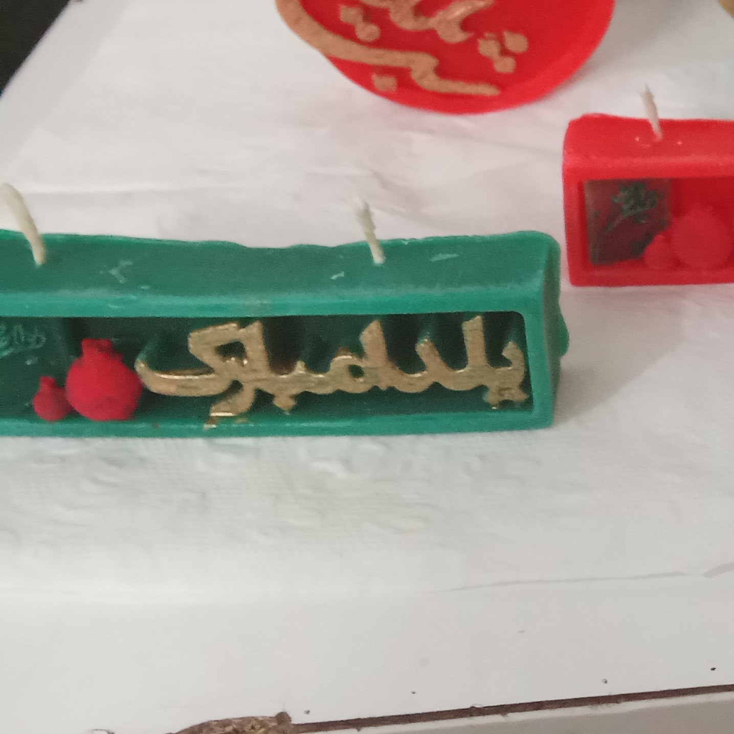 شمع مدل کتیبه یلدا مبارک در رنگ های ،سبز ،سفید،قرمز قابل سفارش